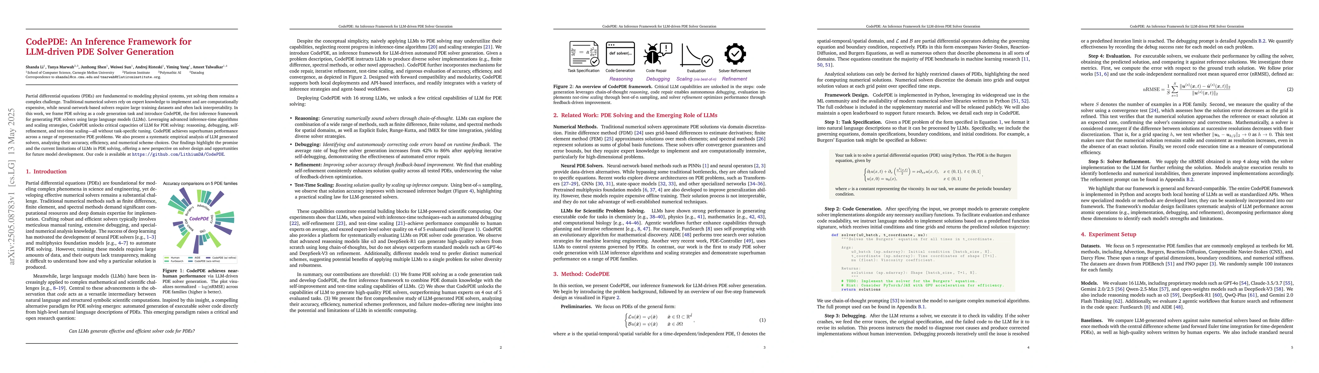 CodePDE, an inference framework for generating PDE solvers using LLMs, which capitalizes on reasoning, debugging, self-refinement, and test-time scaling capabilities of LLMs.