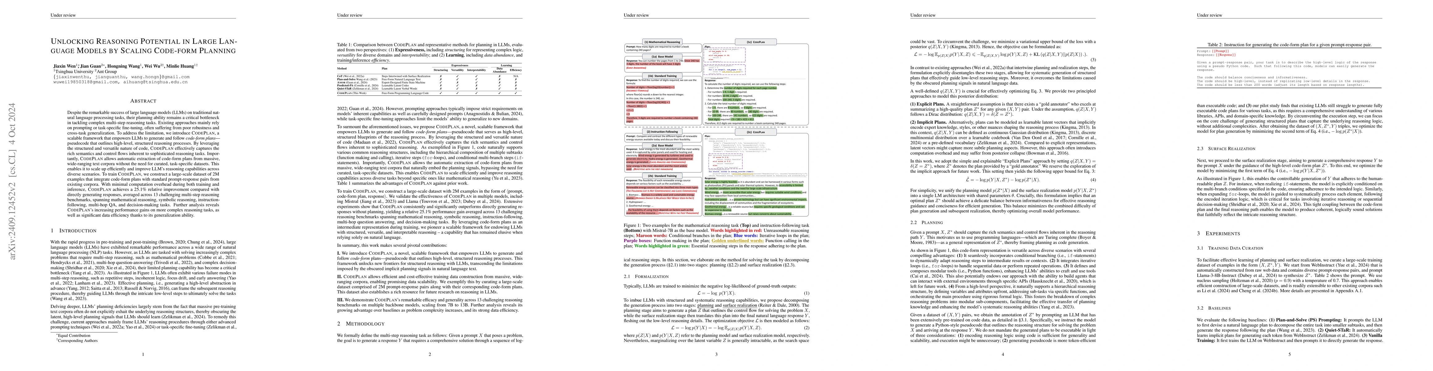 The research introduces CODEPLAN, a scalable paradigm that leverages code-form plans to enhance large language models' (LLMs) reasoning capabilities by generating and following structured, high-level reasoning processes outlined in pseudocode. CODEPLAN is trained on a large-scale dataset of 2M examples, integrating code-form plans with standard prompt-response pairs from existing corpora.
