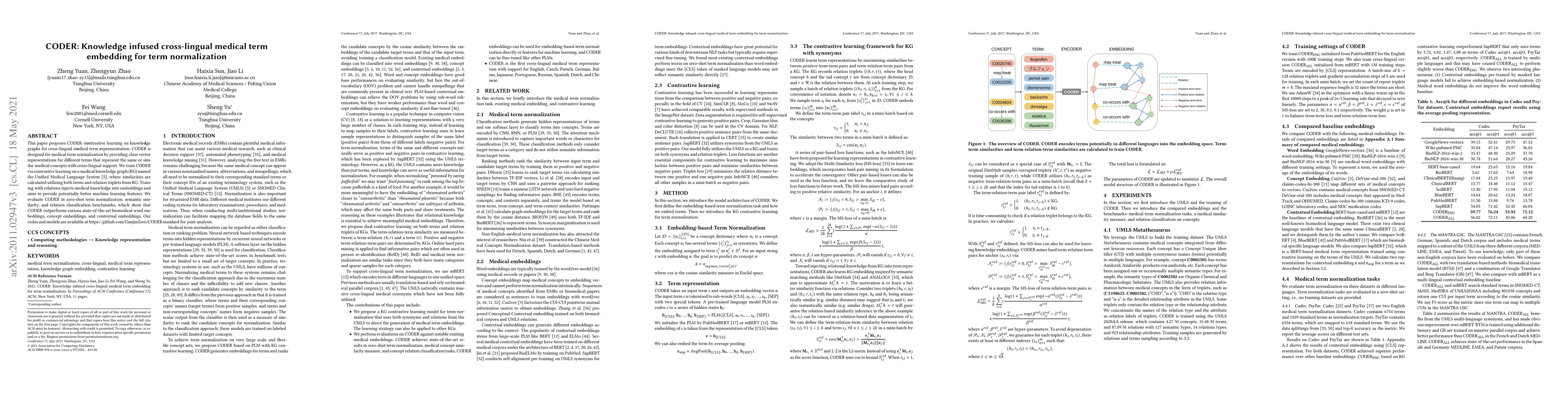 CODER leverages contrastive learning on medical knowledge graphs to create cross-lingual embeddings for medical term normalization, outperforming existing methods in zero-shot term normalization, semantic similarity, and relation classification. The approach uses both terms and relation triplets from the Unified Medical Language System to infuse medical knowledge into the embeddings.