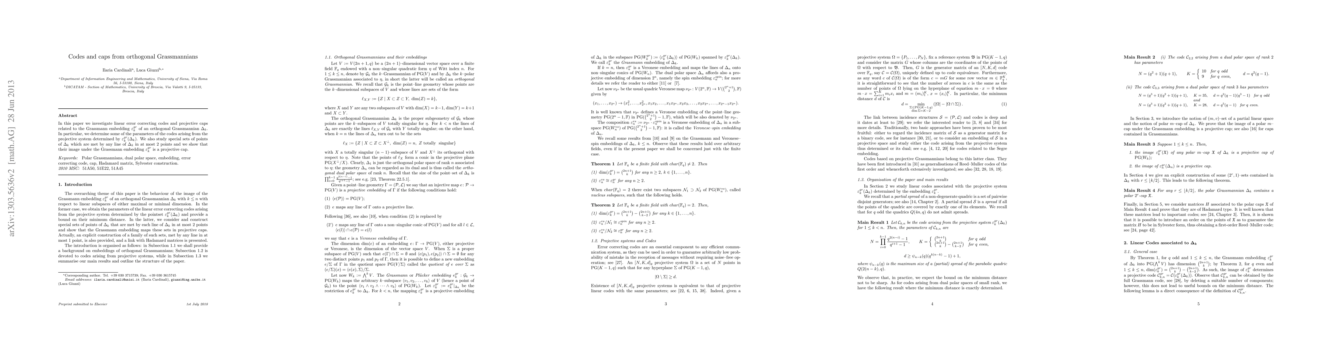 This paper explores linear error correcting codes and projective caps derived from the orthogonal Grassmannian's Grassmann embedding, determining parameters of the codes and identifying special sets of points that form projective caps under this embedding.