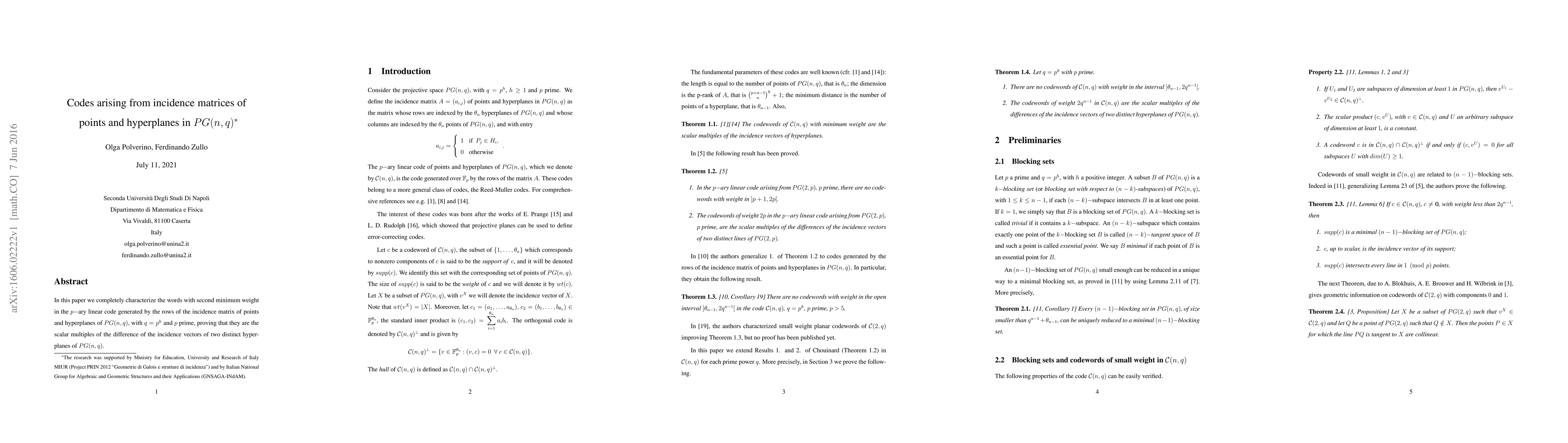 The paper characterizes the words with the second minimum weight in a $p$-ary linear code derived from the incidence matrix of points and hyperplanes in $PG(n,q)$, proving they are scalar multiples of the difference between incidence vectors of two distinct hyperplanes.