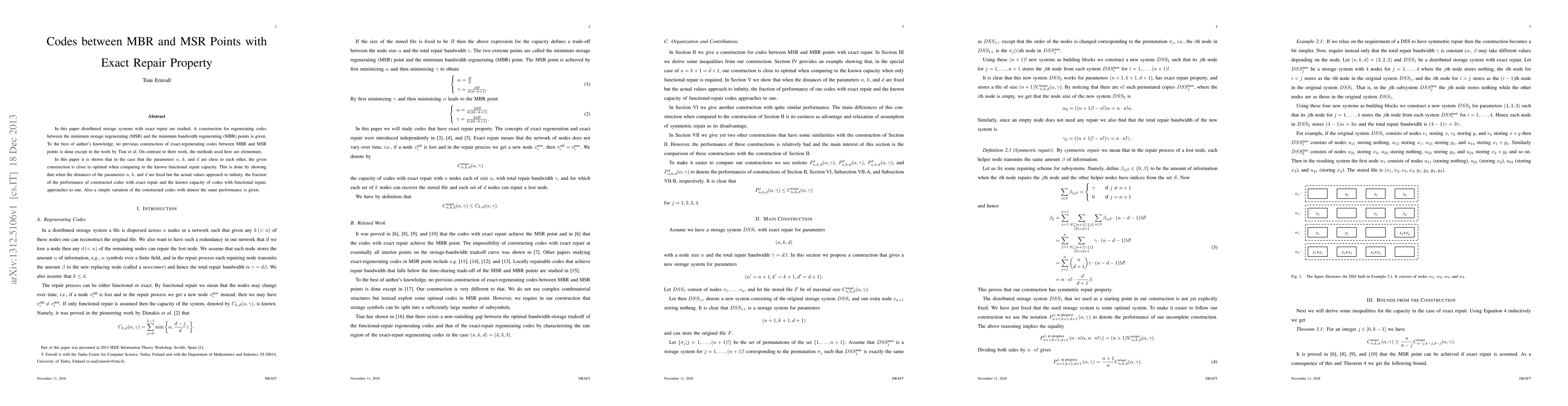 In this paper distributed storage systems with exact repair are studied. A construction for regenerating codes between the minimum storage regenerating (MSR) and the minimum bandwidth regenerating (MBR) points is given. To the best of author's knowledge, no previous construction of exact-regenerating codes between MBR and MSR points is done except in the work by Tian et al. On contrast to their work, the methods used here are elementary. In this paper it is shown that in the case that the parameters $n$, $k$, and $d$ are close to each other, the given construction is close to optimal when comparing to the known functional repair capacity. This is done by showing that when the distances of the parameters $n$, $k$, and $d$ are fixed but the actual values approach to infinity, the fraction of the performance of constructed codes with exact repair and the known capacity of codes with functional repair, approaches to one. Also a simple variation of the constructed codes with almost the same performance is given.