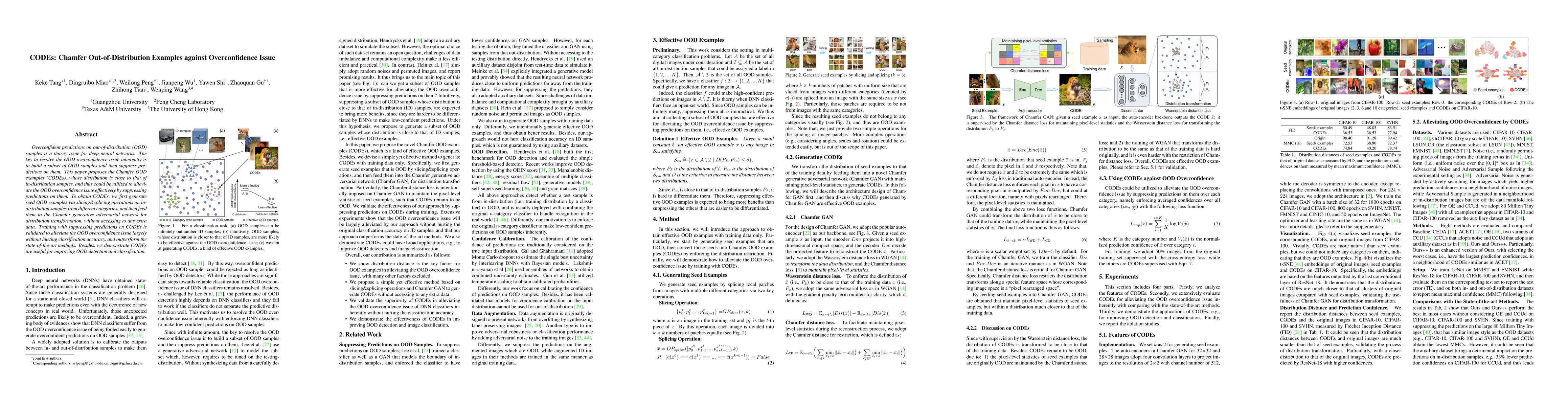 Overconfident predictions on out-of-distribution (OOD) samples is a thorny issue for deep neural networks. The key to resolve the OOD overconfidence issue inherently is to build a subset of OOD samples and then suppress predictions on them. This paper proposes the Chamfer OOD examples (CODEs), whose distribution is close to that of in-distribution samples, and thus could be utilized to alleviate the OOD overconfidence issue effectively by suppressing predictions on them. To obtain CODEs, we first generate seed OOD examples via slicing&splicing operations on in-distribution samples from different categories, and then feed them to the Chamfer generative adversarial network for distribution transformation, without accessing to any extra data. Training with suppressing predictions on CODEs is validated to alleviate the OOD overconfidence issue largely without hurting classification accuracy, and outperform the state-of-the-art methods. Besides, we demonstrate CODEs are useful for improving OOD detection and classification.