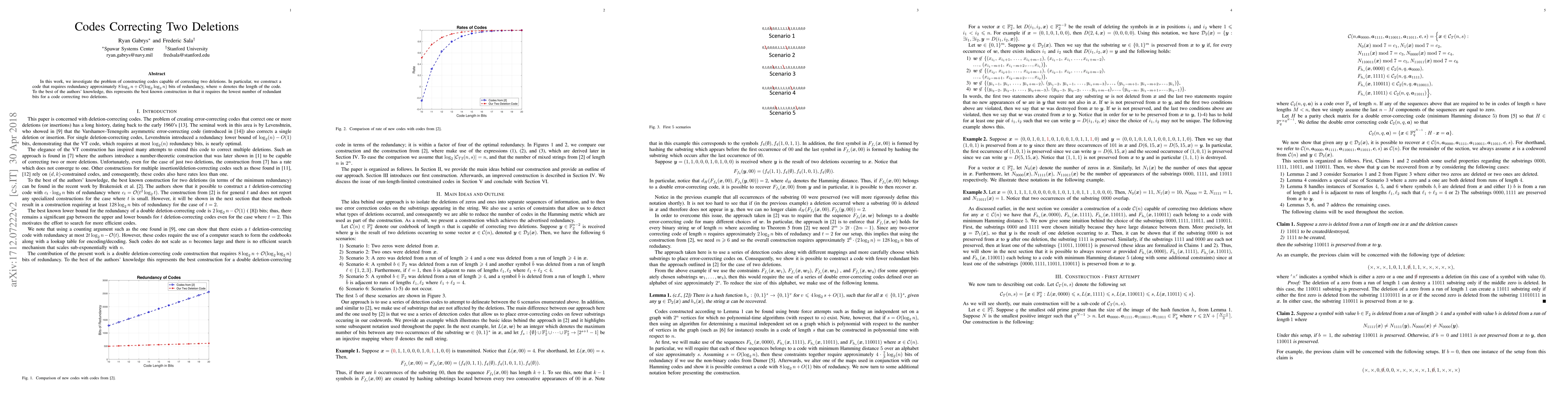 This paper constructs a code that can correct two deletions with a redundancy of approximately 8 log n + O(log log n) bits, representing the most efficient known solution for such codes. The study aims to minimize the number of redundant bits required for deletion correction.