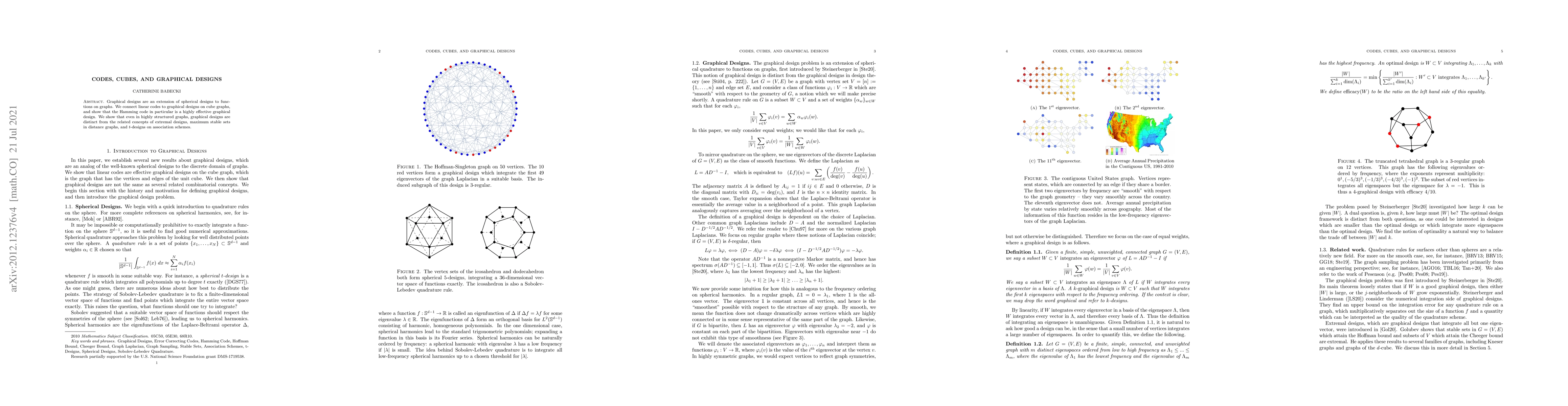 Graphical designs are an extension of spherical designs to functions on graphs. We connect linear codes to graphical designs on cube graphs, and show that the Hamming code in particular is a highly effective graphical design. We show that even in highly structured graphs, graphical designs are distinct from the related concepts of extremal designs, maximum stable sets in distance graphs, and $t$-designs on association schemes.