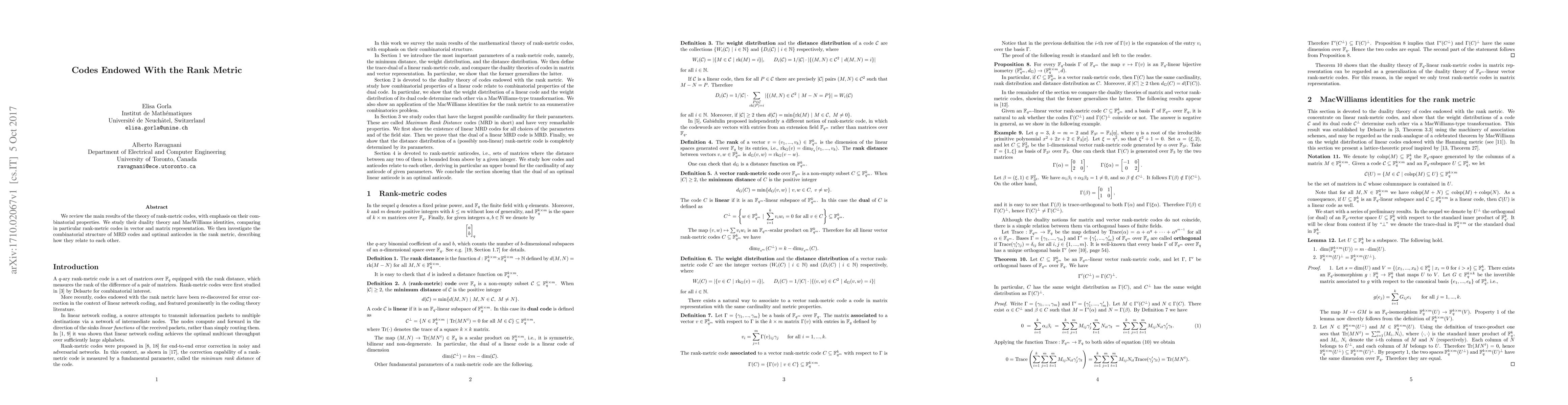 This paper reviews the combinatorial properties and duality theory of rank-metric codes, focusing on their vector and matrix representations, and explores the relationships between MRD codes and optimal anticodes in the rank metric.