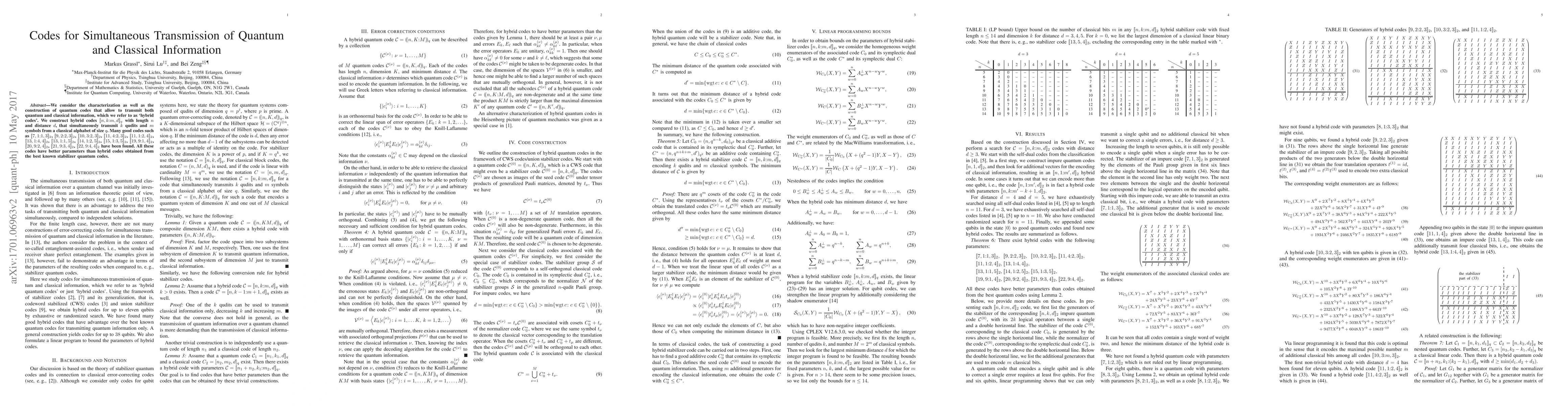 We consider the characterization as well as the construction of quantum codes that allow to transmit both quantum and classical information, which we refer to as `hybrid codes'. We construct hybrid codes $[\![n,k{: }m,d]\!]_q$ with length $n$ and distance $d$, that simultaneously transmit $k$ qudits and $m$ symbols from a classical alphabet of size $q$. Many good codes such as $[\![7,1{: }1,3]\!]_2$, $[\![9,2{: }2,3]\!]_2$, $[\![10,3{: }2,3]\!]_2$, $[\![11,4{: }2,3]\!]_2$, $[\![11,1{: }2,4]\!]_2$, $[\![13,1{: }4,4]\!]_2$, $[\![13,1{: }1,5]\!]_2$, $[\![14,1{: }2,5]\!]_2$, $[\![15,1{: }3,5]\!]_2$, $[\![19,9{: }1,4]\!]_2$, $[\![20,9{: }2,4]\!]_2$, $[\![21,9{: }3,4]\!]_2$, $[\![22,9{: }4,4]\!]_2$ have been found. All these codes have better parameters than hybrid codes obtained from the best known stabilizer quantum codes.