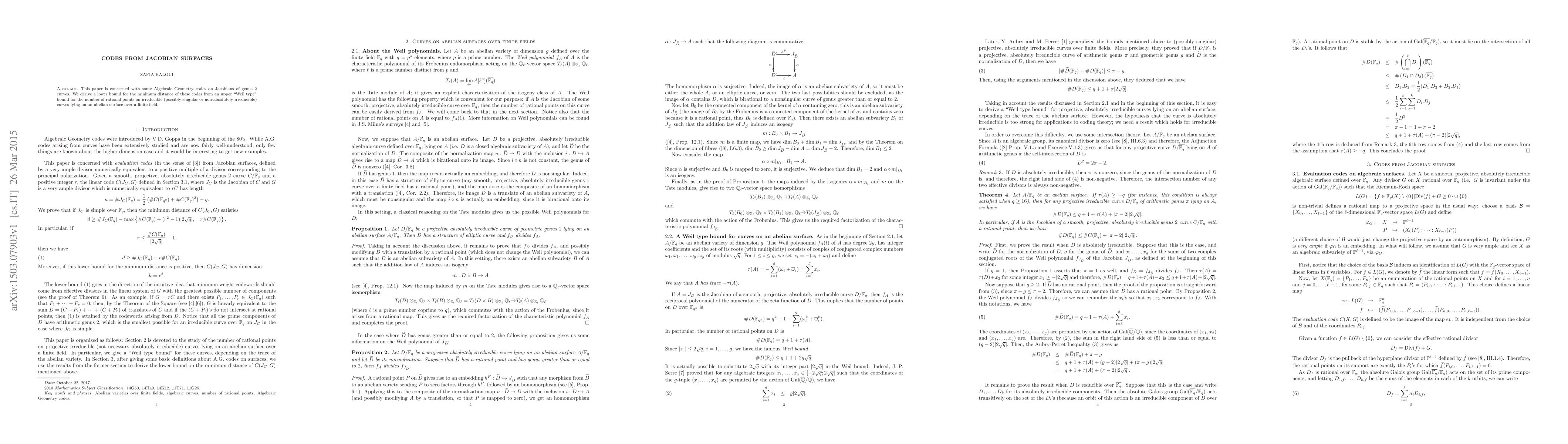 This paper is concerned with some Algebraic Geometry codes on Jacobians of genus 2 curves. We derive a lower bound for the minimum distance of these codes from an upper "Weil type" bound for the number of rational points on irreducible (possibly singular or non-absolutely irreducible) curves lying on an abelian surface over a finite field.