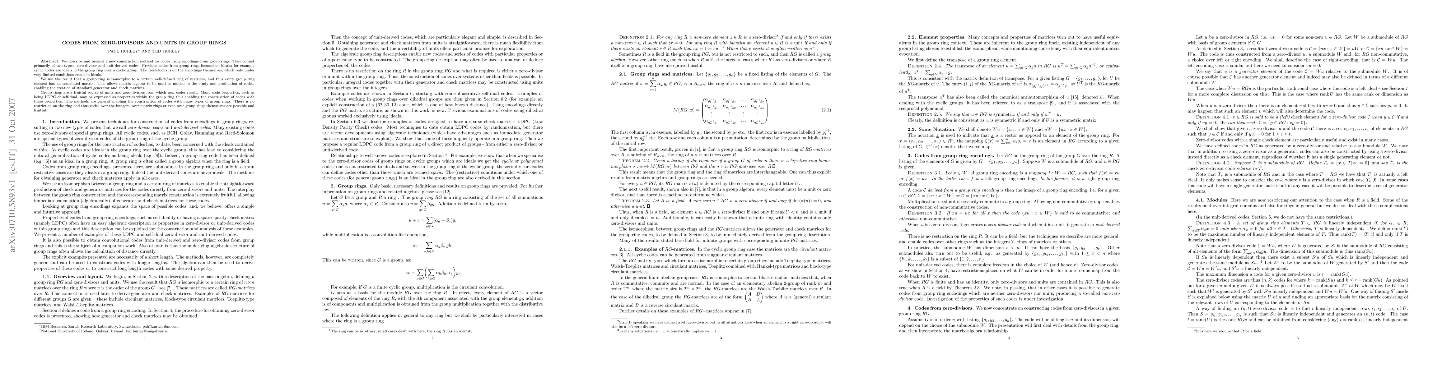 We describe and present a new construction method for codes using encodings from group rings. They consist primarily of two types: zero-divisor and unit-derived codes. Previous codes from group rings focused on ideals; for example cyclic codes are ideals in the group ring over a cyclic group. The fresh focus is on the encodings themselves, which only under very limited conditions result in ideals. We use the result that a group ring is isomorphic to a certain well-defined ring of matrices, and thus every group ring element has an associated matrix. This allows matrix algebra to be used as needed in the study and production of codes, enabling the creation of standard generator and check matrices. Group rings are a fruitful source of units and zero-divisors from which new codes result. Many code properties, such as being LDPC or self-dual, may be expressed as properties within the group ring thus enabling the construction of codes with these properties. The methods are general enabling the construction of codes with many types of group rings. There is no restriction on the ring and thus codes over the integers, over matrix rings or even over group rings themselves are possible and fruitful.