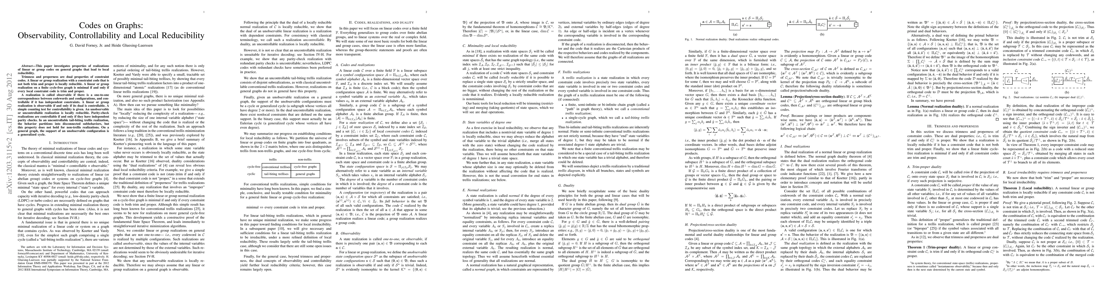 This paper investigates properties of realizations of linear or group codes on general graphs that lead to local reducibility. Trimness and properness are dual properties of constraint codes. A linear or group realization with a constraint code that is not both trim and proper is locally reducible. A linear or group realization on a finite cycle-free graph is minimal if and only if every local constraint code is trim and proper. A realization is called observable if there is a one-to-one correspondence between codewords and configurations, and controllable if it has independent constraints. A linear or group realization is observable if and only if its dual is controllable. A simple counting test for controllability is given. An unobservable or uncontrollable realization is locally reducible. Parity-check realizations are controllable if and only if they have independent parity checks. In an uncontrollable tail-biting trellis realization, the behavior partitions into disconnected subbehaviors, but this property does not hold for non-trellis realizations. On a general graph, the support of an unobservable configuration is a generalized cycle.
