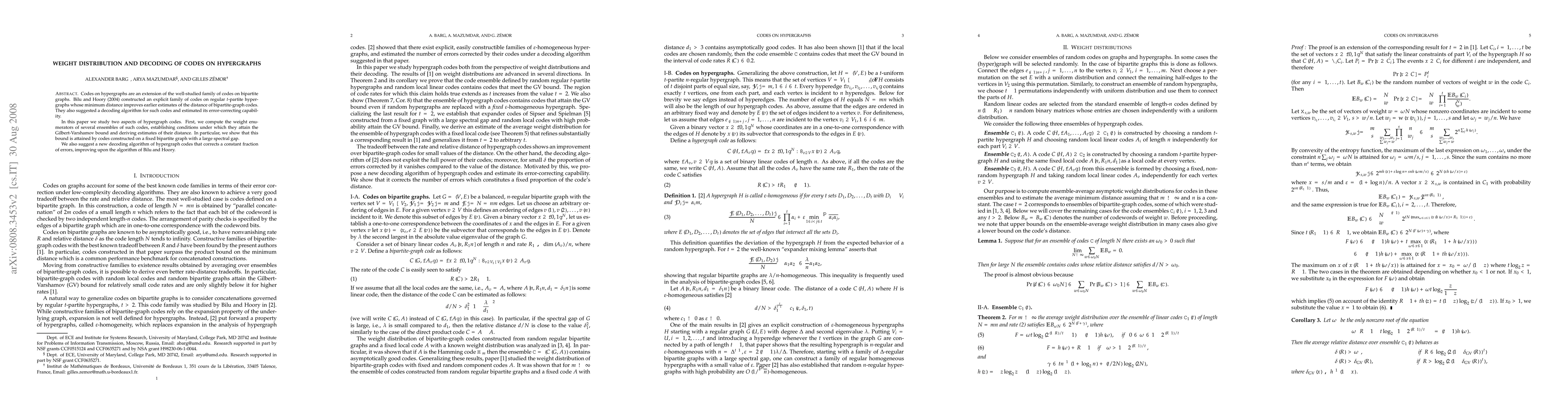 Codes on hypergraphs are an extension of the well-studied family of codes on bipartite graphs. Bilu and Hoory (2004) constructed an explicit family of codes on regular t-partite hypergraphs whose minimum distance improves earlier estimates of the distance of bipartite-graph codes. They also suggested a decoding algorithm for such codes and estimated its error-correcting capability. In this paper we study two aspects of hypergraph codes. First, we compute the weight enumerators of several ensembles of such codes, establishing conditions under which they attain the Gilbert-Varshamov bound and deriving estimates of their distance. In particular, we show that this bound is attained by codes constructed on a fixed bipartite graph with a large spectral gap. We also suggest a new decoding algorithm of hypergraph codes that corrects a constant fraction of errors, improving upon the algorithm of Bilu and Hoory.