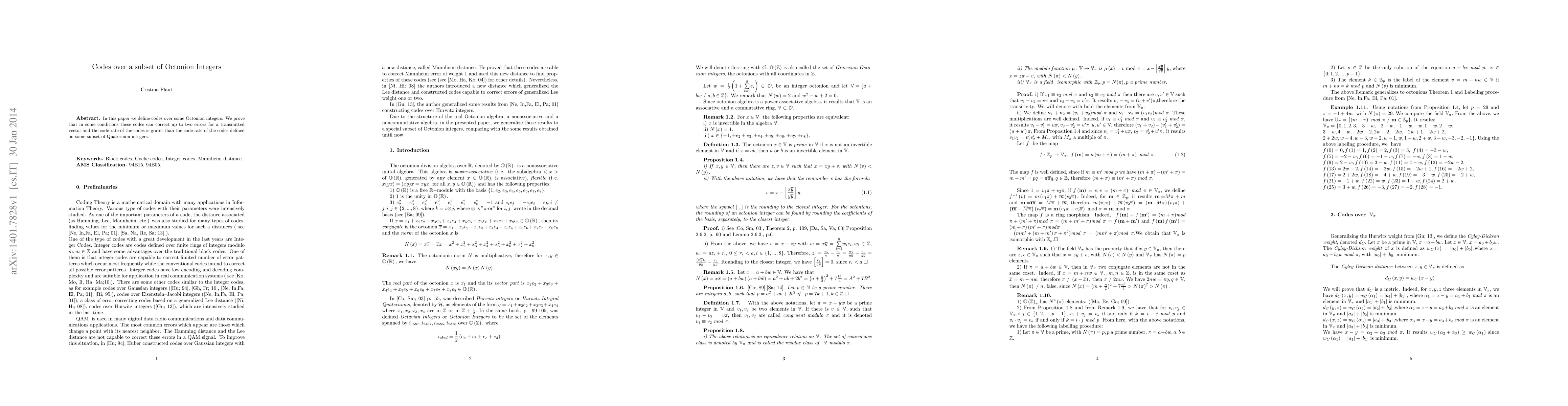 Summary: This paper introduces codes based on a subset of Octonion integers, demonstrating that under certain conditions, these codes can correct up to two errors and have a higher code rate compared to codes defined over a subset of Quaternion integers.