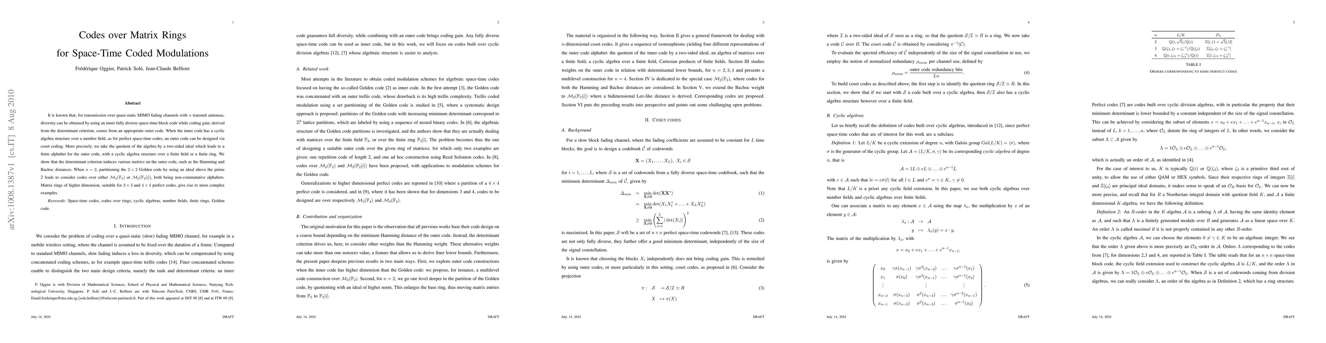 It is known that, for transmission over quasi-static MIMO fading channels with n transmit antennas, diversity can be obtained by using an inner fully diverse space-time block code while coding gain, derived from the determinant criterion, comes from an appropriate outer code. When the inner code has a cyclic algebra structure over a number field, as for perfect space-time codes, an outer code can be designed via coset coding. More precisely, we take the quotient of the algebra by a two-sided ideal which leads to a finite alphabet for the outer code, with a cyclic algebra structure over a finite field or a finite ring. We show that the determinant criterion induces various metrics on the outer code, such as the Hamming and Bachoc distances. When n=2, partitioning the 2x2 Golden code by using an ideal above the prime 2 leads to consider codes over either M2(F_2) or M2(F_2[i]), both being non-commutative alphabets. Matrix rings of higher dimension, suitable for 3x3 and 4x4 perfect codes, give rise to more complex examples.