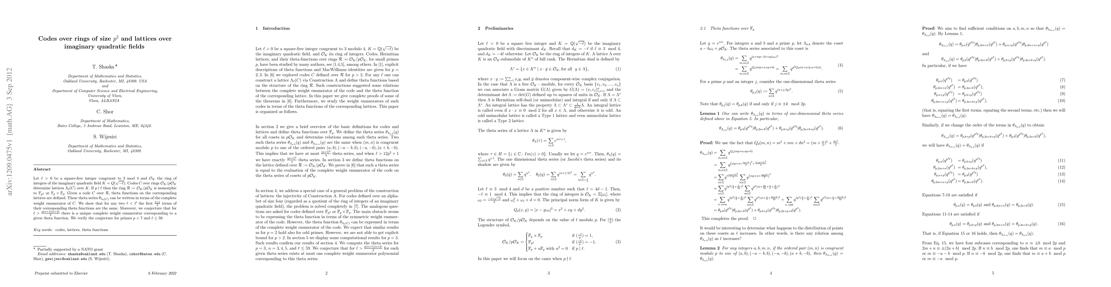 Let $\ell>0$ be a square-free integer congruent to 3 mod 4 and $\O_K$ the ring of integers of the imaginary quadratic field $K=Q(\sqrt{-\ell})$. Codes $C$ over rings $\O_K / p \O_K$ determine lattices $\Lambda_\ell (C) $ over $K$. If $ p \nmid \ell$ then the ring $\R:=\O_K / p \O_K$ is isomorphic to $\F_{p^2}$ or $\F_p \times \F_p$. Given a code $C$ over $\R$, theta functions on the corresponding lattices are defined. These theta series $\theta_{\Lambda_{\ell}(C)}$ can be written in terms of the complete weight enumerator of $C$. We show that for any two $\ell < \ell^\prime$ the first $\frac {\ell + 1} 4$ terms of their corresponding theta functions are the same. Moreover, we conjecture that for $\ell > \frac {p(n+1)(n+2)} 2$ there is a unique complete weight enumerator corresponding to a given theta function. We verify the conjecture for primes $p< 7$ and $\ell \leq 59$.