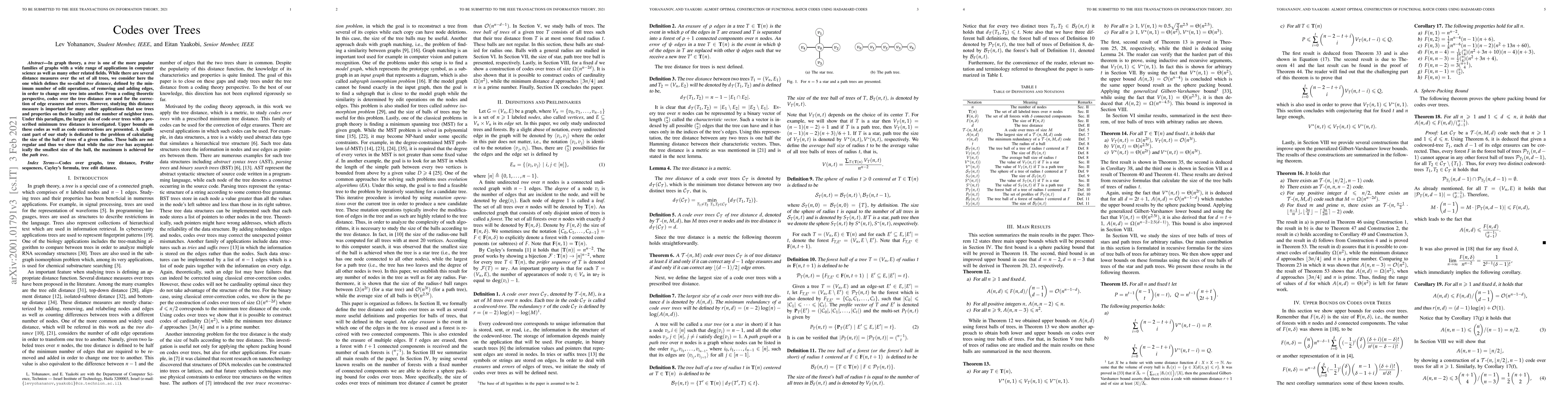 This paper explores codes over trees in graph theory, focusing on the tree distance defined by the minimum edit operations to transform one tree into another. It presents upper bounds and constructions for largest size codes with prescribed minimum tree distance, and investigates the size of balls of trees of a given radius. The study reveals that while star trees have asymptotically smallest balls, path trees achieve the maximum.