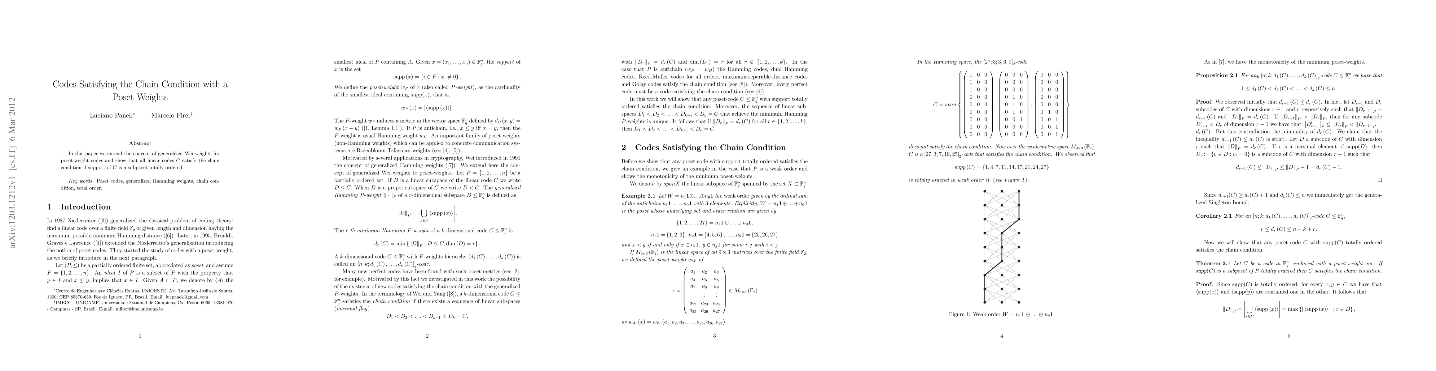 Summary: This paper extends generalized Wei weights for poset-weight codes and demonstrates that all linear codes C meet the chain condition when their support forms a totally ordered subposet.
