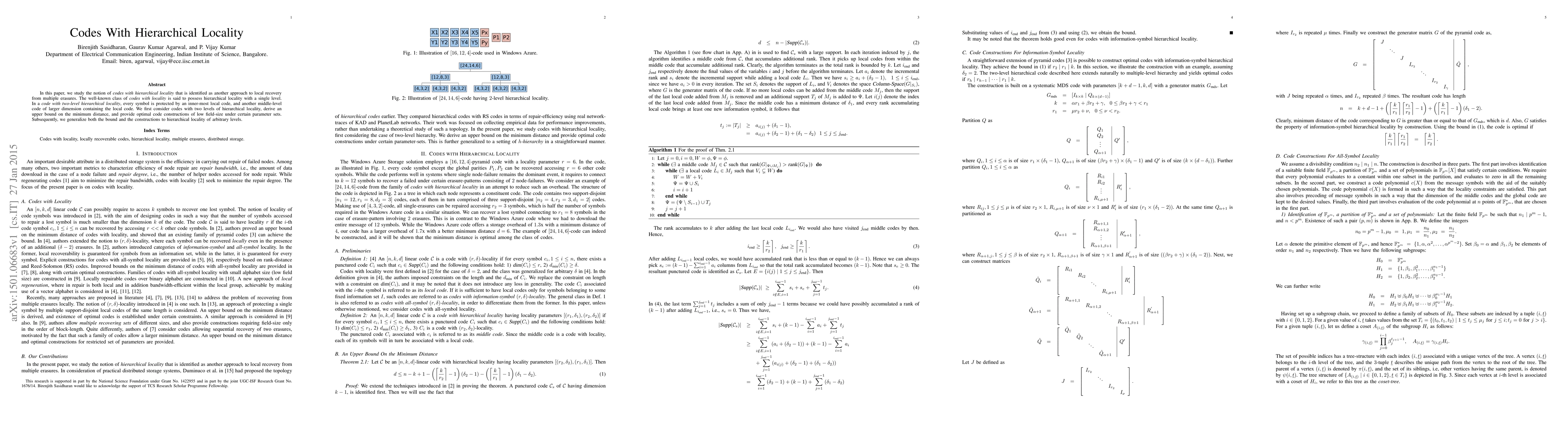 This paper explores codes with hierarchical locality, a method for local recovery from multiple erasures, extending beyond single-level locality. It derives an upper bound for codes with two-level hierarchical locality and provides optimal constructions with low field-size, then generalizes these findings to arbitrary levels of hierarchical locality.