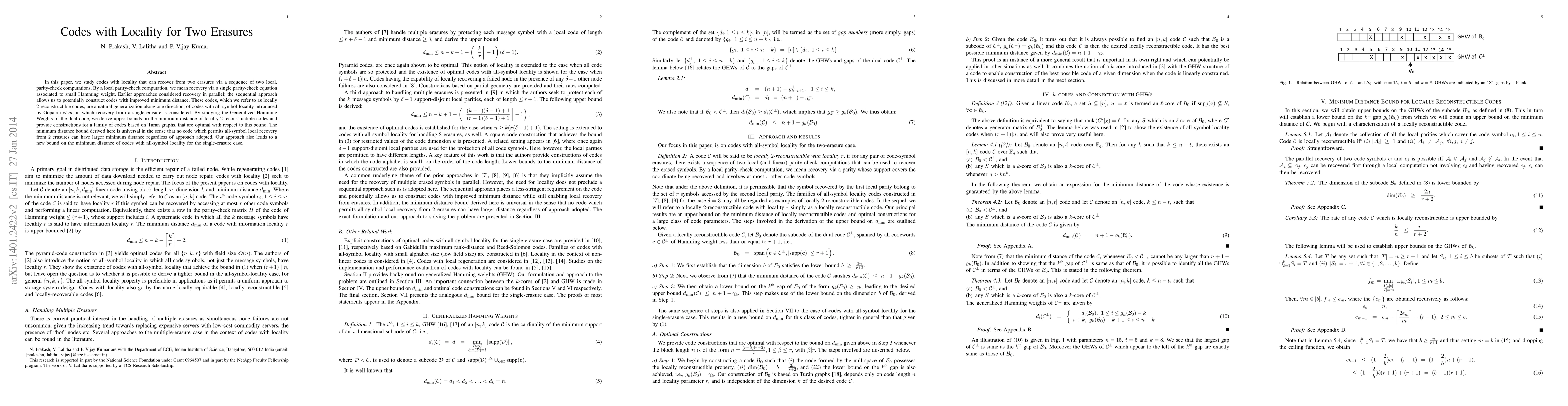 In this paper, we study codes with locality that can recover from two erasures via a sequence of two local, parity-check computations. By a local parity-check computation, we mean recovery via a single parity-check equation associated to small Hamming weight. Earlier approaches considered recovery in parallel; the sequential approach allows us to potentially construct codes with improved minimum distance. These codes, which we refer to as locally 2-reconstructible codes, are a natural generalization along one direction, of codes with all-symbol locality introduced by Gopalan \textit{et al}, in which recovery from a single erasure is considered. By studying the Generalized Hamming Weights of the dual code, we derive upper bounds on the minimum distance of locally 2-reconstructible codes and provide constructions for a family of codes based on Tur\'an graphs, that are optimal with respect to this bound. The minimum distance bound derived here is universal in the sense that no code which permits all-symbol local recovery from $2$ erasures can have larger minimum distance regardless of approach adopted. Our approach also leads to a new bound on the minimum distance of codes with all-symbol locality for the single-erasure case.