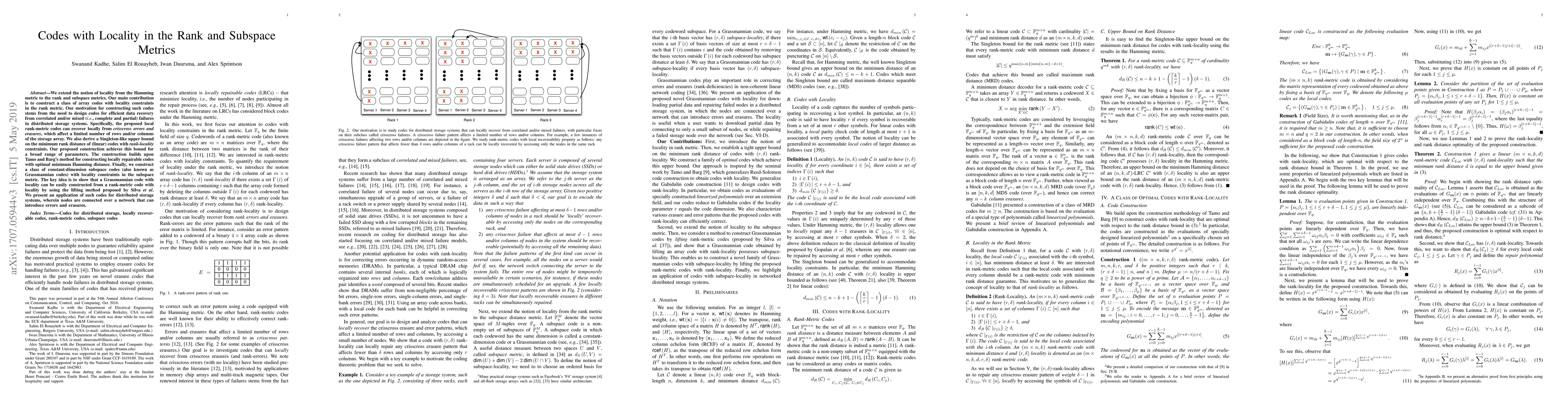 We extend the notion of locality from the Hamming metric to the rank and subspace metrics. Our main contribution is to construct a class of array codes with locality constraints in the rank metric. Our motivation for constructing such codes stems from designing codes for efficient data recovery from correlated and/or mixed (i.e., complete and partial) failures in distributed storage systems. Specifically, the proposed local rank-metric codes can recover locally from 'crisscross errors and erasures', which affect a limited number of rows and/or columns of the storage system. We also derive a Singleton-like upper bound on the minimum rank distance of (linear) codes with 'rank-locality' constraints. Our proposed construction achieves this bound for a broad range of parameters. The construction builds upon Tamo and Barg's method for constructing locally repairable codes with optimal minimum Hamming distance. Finally, we construct a class of constant-dimension subspace codes (also known as Grassmannian codes) with locality constraints in the subspace metric. The key idea is to show that a Grassmannian code with locality can be easily constructed from a rank-metric code with locality by using the lifting method proposed by Silva et al. We present an application of such codes for distributed storage systems, wherein nodes are connected over a network that can introduce errors and erasures.