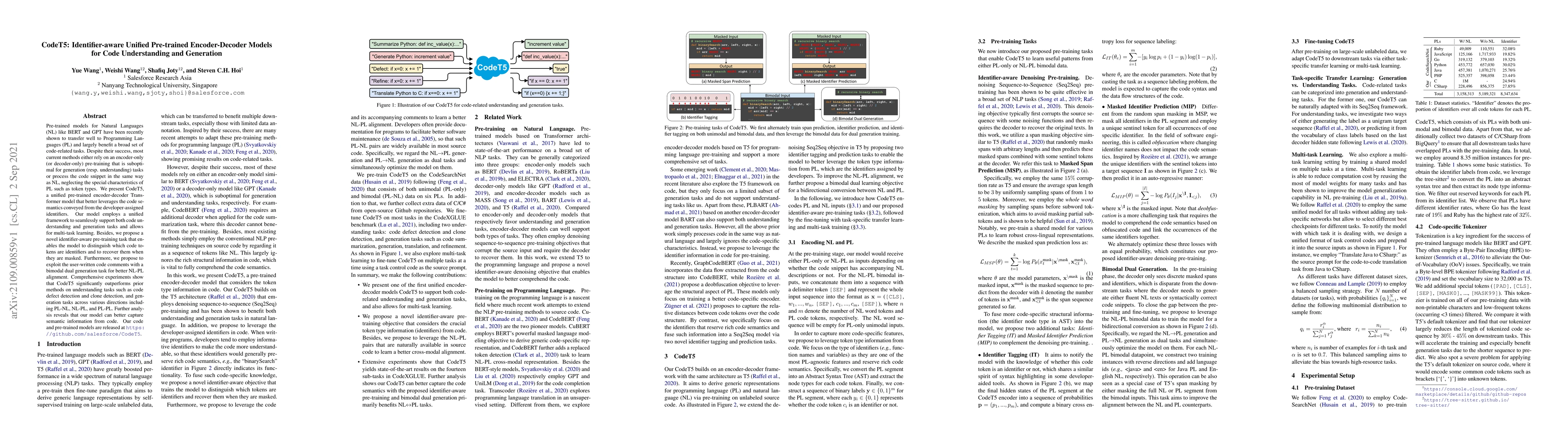 Pre-trained models for Natural Languages (NL) like BERT and GPT have been recently shown to transfer well to Programming Languages (PL) and largely benefit a broad set of code-related tasks. Despite their success, most current methods either rely on an encoder-only (or decoder-only) pre-training that is suboptimal for generation (resp. understanding) tasks or process the code snippet in the same way as NL, neglecting the special characteristics of PL such as token types. We present CodeT5, a unified pre-trained encoder-decoder Transformer model that better leverages the code semantics conveyed from the developer-assigned identifiers. Our model employs a unified framework to seamlessly support both code understanding and generation tasks and allows for multi-task learning. Besides, we propose a novel identifier-aware pre-training task that enables the model to distinguish which code tokens are identifiers and to recover them when they are masked. Furthermore, we propose to exploit the user-written code comments with a bimodal dual generation task for better NL-PL alignment. Comprehensive experiments show that CodeT5 significantly outperforms prior methods on understanding tasks such as code defect detection and clone detection, and generation tasks across various directions including PL-NL, NL-PL, and PL-PL. Further analysis reveals that our model can better capture semantic information from code. Our code and pre-trained models are released at https: //github.com/salesforce/CodeT5 .