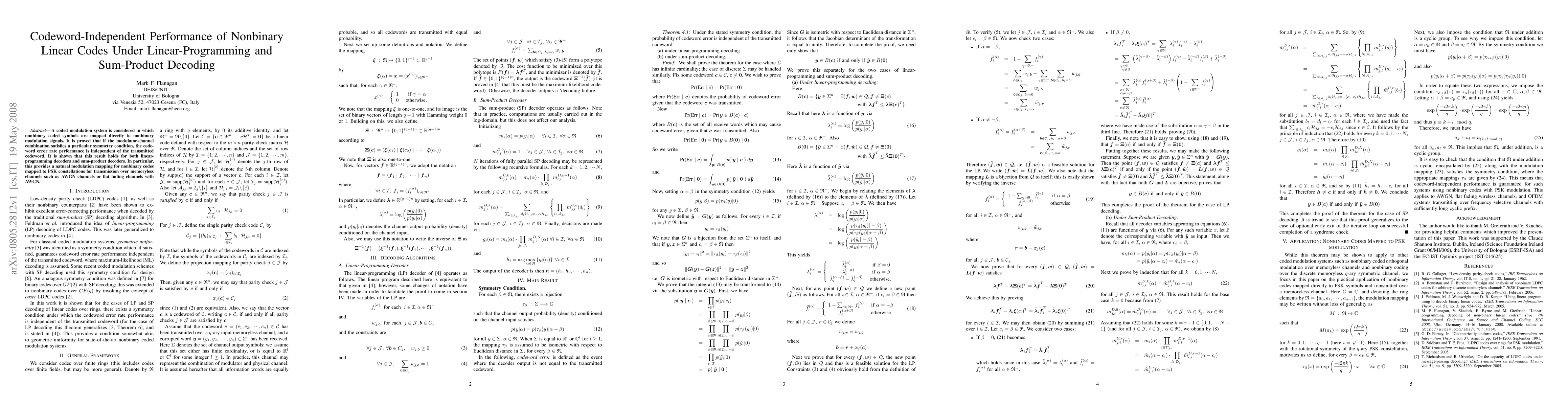 The paper establishes a codeword-independent error rate performance for nonbinary linear codes under linear-programming and sum-product decoding, given a specific symmetry condition on the modulator-channel combination.