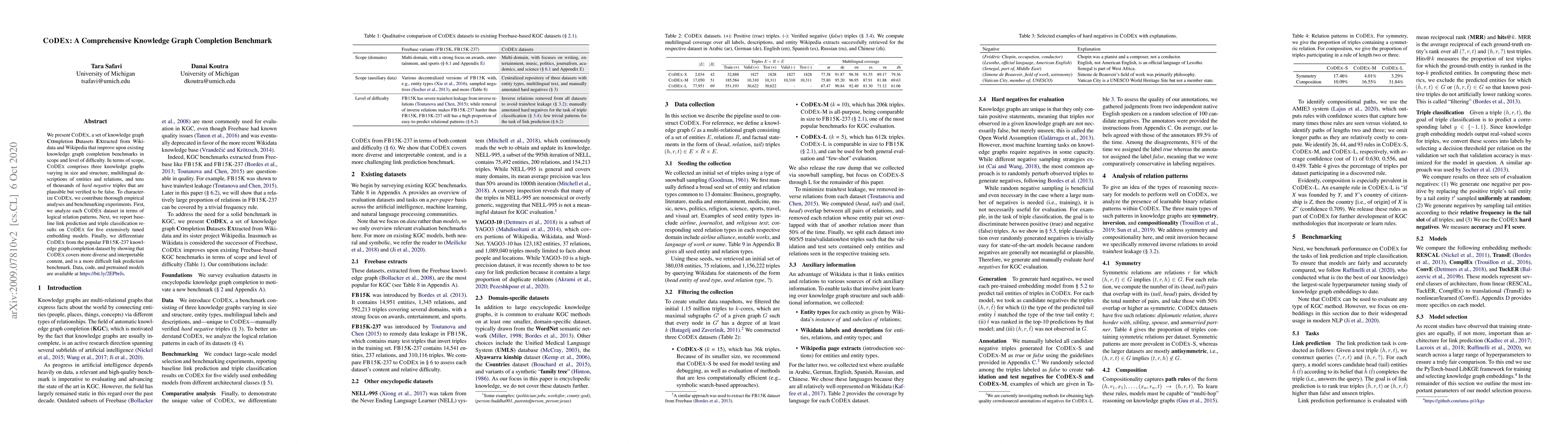 We present CoDEx, a set of knowledge graph completion datasets extracted from Wikidata and Wikipedia that improve upon existing knowledge graph completion benchmarks in scope and level of difficulty. In terms of scope, CoDEx comprises three knowledge graphs varying in size and structure, multilingual descriptions of entities and relations, and tens of thousands of hard negative triples that are plausible but verified to be false. To characterize CoDEx, we contribute thorough empirical analyses and benchmarking experiments. First, we analyze each CoDEx dataset in terms of logical relation patterns. Next, we report baseline link prediction and triple classification results on CoDEx for five extensively tuned embedding models. Finally, we differentiate CoDEx from the popular FB15K-237 knowledge graph completion dataset by showing that CoDEx covers more diverse and interpretable content, and is a more difficult link prediction benchmark. Data, code, and pretrained models are available at https://bit.ly/2EPbrJs.