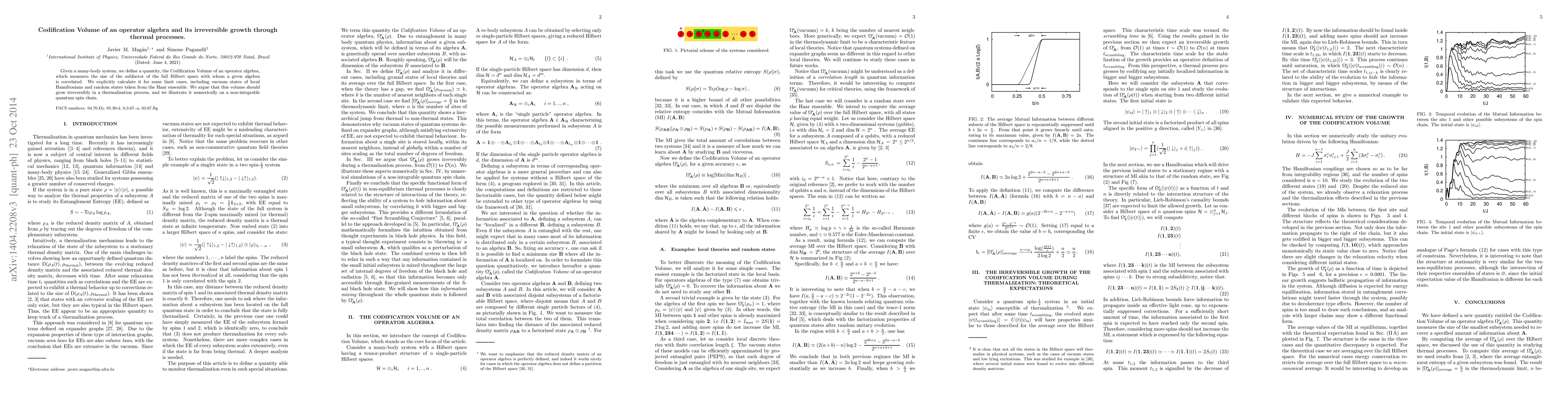 Given a many-body system, we define a quantity, the Codification Volume of an operator algebra, which measures the size of the subspace with whom a given algebra is correlated. We explicitly calculate it for some limit cases, including vacuum states of local Hamiltonians and random states taken from the Haar ensemble. We argue that this volume should grow irreversibly in a thermalization process, and illustrate it numerically on a non-integrable quantum spin chain.