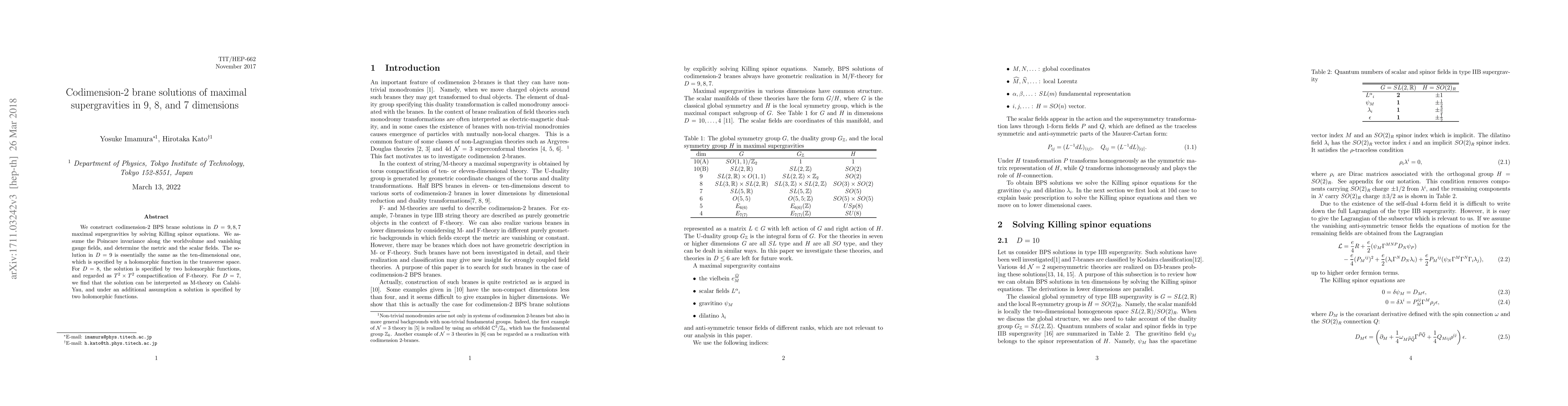 This paper constructs codimension-2 BPS brane solutions in maximal supergravities of dimensions 9, 8, and 7 by solving Killing spinor equations, revealing similarities and differences in solutions across these dimensions. The $D=9$ solution mirrors the ten-dimensional one, while $D=8$ and $D=7$ solutions involve compactifications and M-theory on Calabi-Yau manifolds.