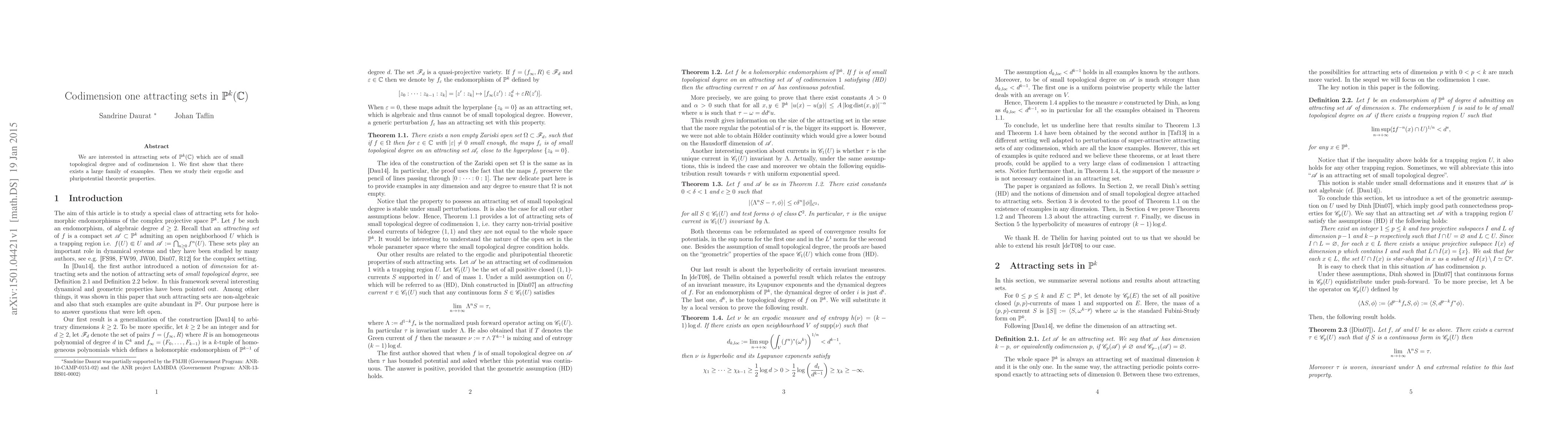 Summary: This paper explores codimension one attracting sets in complex projective space, demonstrating the existence of a diverse set of such examples and investigating their ergodic and pluripotential theoretical characteristics.