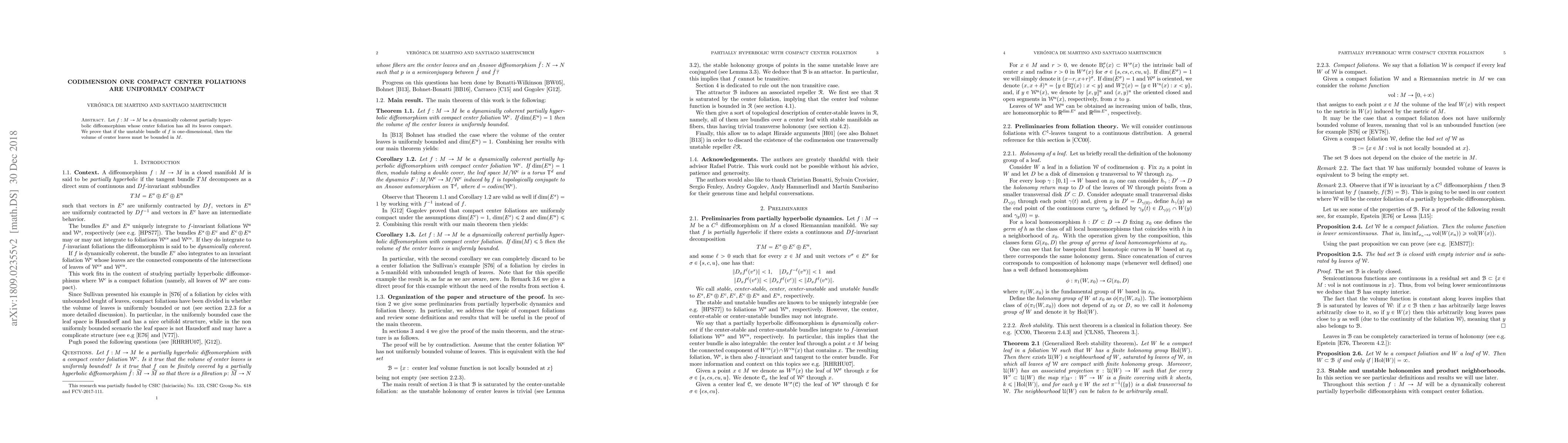 Summary: This paper proves that for a dynamically coherent partially hyperbolic diffeomorphism with compact center leaves, if the unstable bundle is one-dimensional, the volume of these center leaves is uniformly bounded across the manifold $M$.