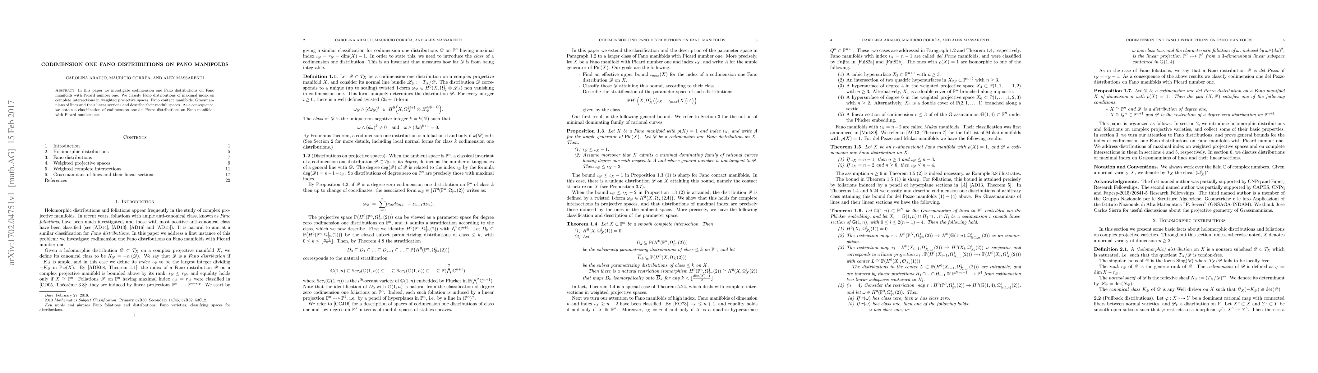 This paper classifies codimension one Fano distributions of maximal index on specific Fano manifolds, including complete intersections, Fano contact manifolds, and Grassmannians, and describes their moduli spaces, leading to a classification of codimension one del Pezzo distributions on Fano manifolds with Picard number one.