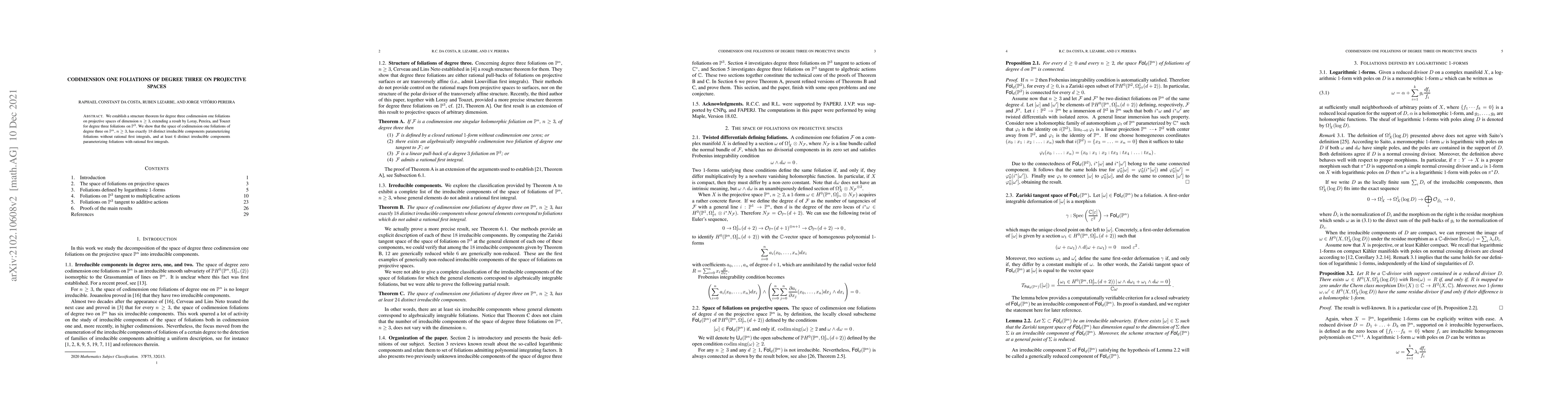 This paper establishes a structure theorem for degree three codimension one foliations on projective spaces of dimension $n\ge 3$, identifying $18$ distinct irreducible components for foliations without rational first integrals and at least $6$ for those with rational first integrals.