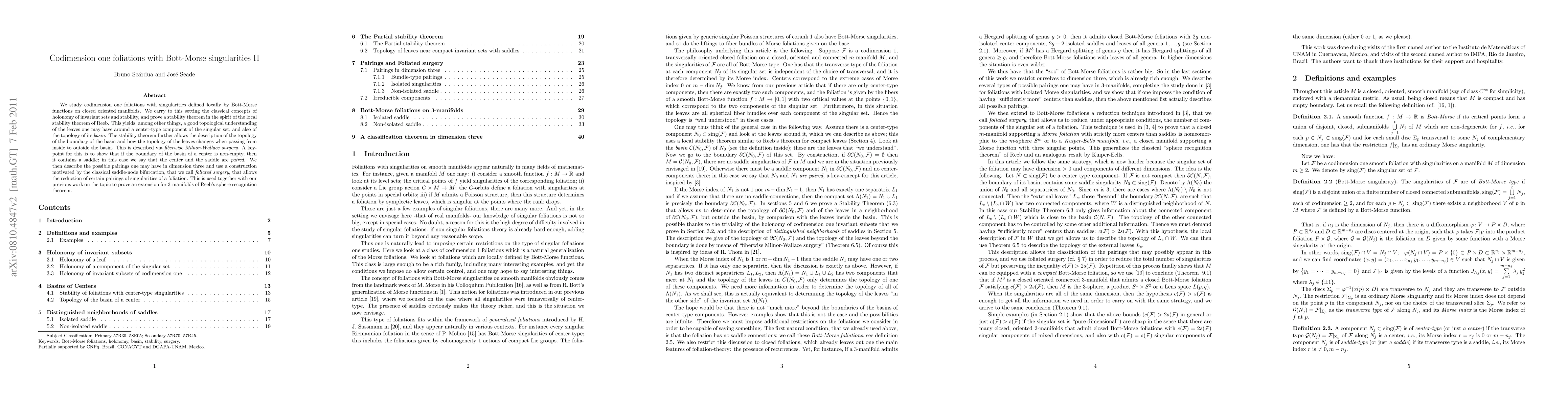 We study codimension one foliations with singularities defined locally by Bott-Morse functions on closed oriented manifolds. We carry to this setting the classical concepts of holonomy of invariant sets and stability, and prove a stability theorem in the spirit of the local stability theorem of Reeb. This yields, among other things, a good topological understanding of the leaves one may have around a center-type component of the singular set, and also of the topology of its basin. The stability theorem further allows the description of the topology of the boundary of the basin and how the topology of the leaves changes when passing from inside to outside the basin. This is described via fiberwise Milnor-Wallace surgery. A key-point for this is to show that if the boundary of the basin of a center is non-empty, then it contains a saddle; in this case we say that the center and the saddle are paired. We then describe the possible pairings one may have in dimension three and use a construction motivated by the classical saddle-node bifurcation, that we call foliated surgery, that allows the reduction of certain pairings of singularities of a foliation. This is used together with our previous work on the topic to prove an extension for 3-manifolds of Reeb's sphere recognition theorem.