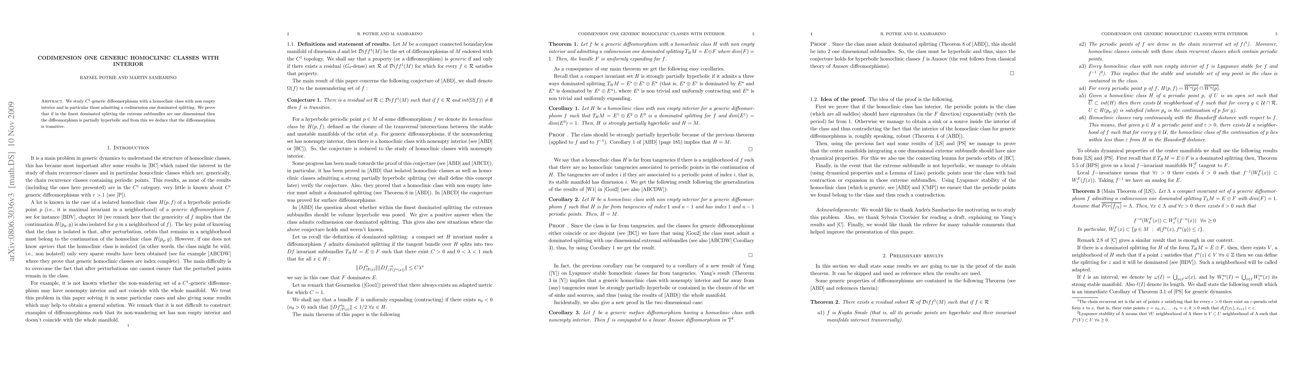We study generic diffeomorphisms with a homoclinc class with non empty interior and in particular those admitting a codimension one dominated splitting. We prove that if in the finest dominated splitting the extreme subbundles are one dimensional then the diffeomorphism is partially hyperbolic and from this we deduce that the diffeomorphism is transitive.