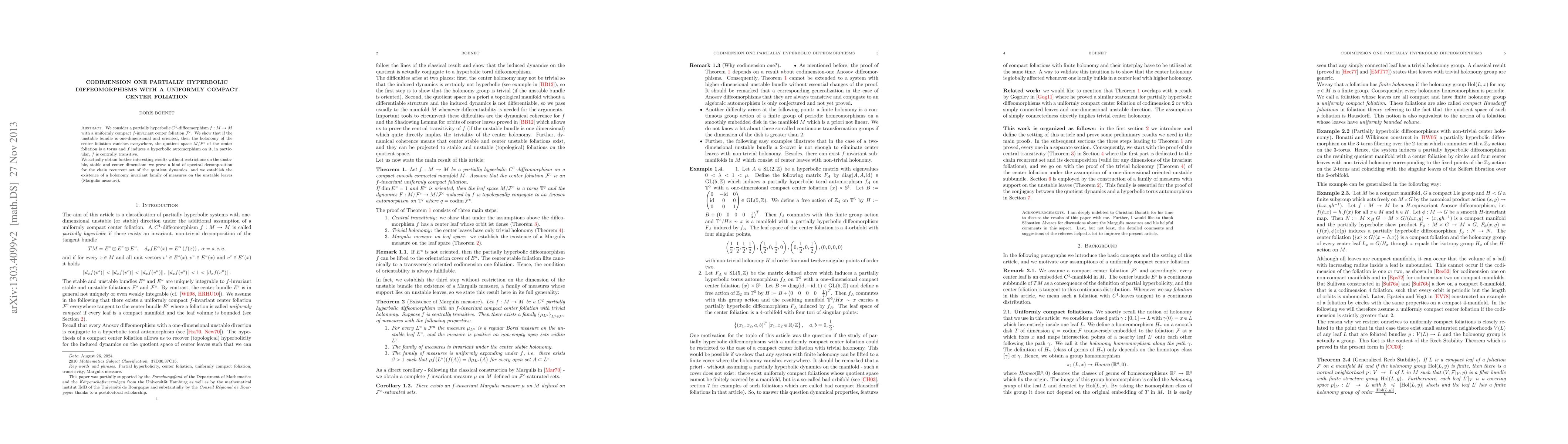 This paper explores a C1-diffeomorphism on a compact manifold with a uniformly compact center foliation, proving that if the unstable bundle is one-dimensional and oriented, the holonomy of the center foliation vanishes, and the quotient space is a torus. It also establishes a spectral decomposition for the chain recurrent set and the existence of a holonomy invariant family of measures on the unstable leaves.
