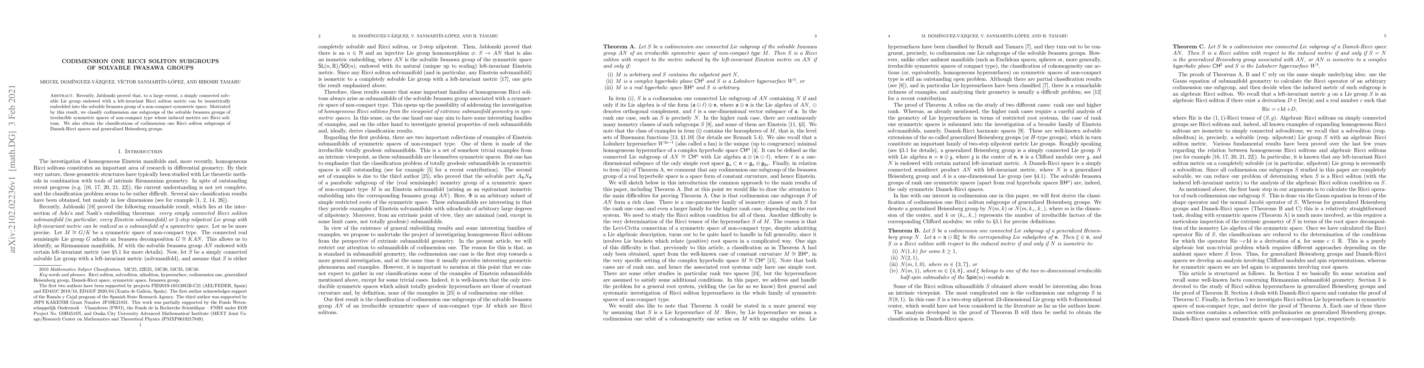The paper classifies codimension one Ricci soliton subgroups within solvable Iwasawa groups of irreducible non-compact symmetric spaces, extending Jablonski's embedding result, and also provides classifications for Damek-Ricci spaces and generalized Heisenberg groups.