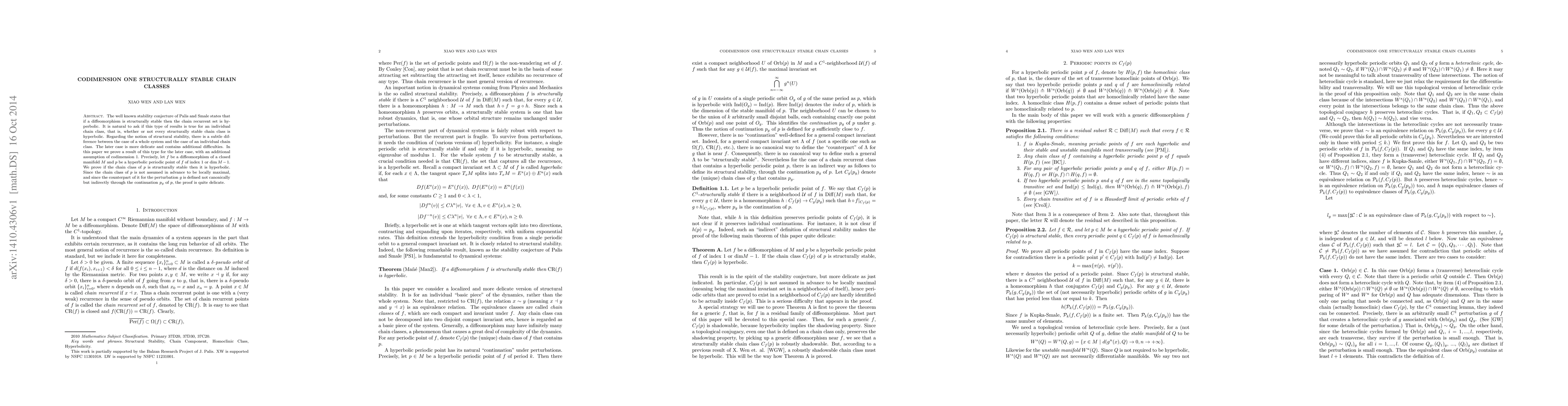 This paper proves that structurally stable chain classes associated with hyperbolic periodic points of codimension one in a diffeomorphism of a closed manifold are hyperbolic, addressing the nuanced differences in structural stability between whole systems and individual chain classes. The proof handles the indirect definition of the chain class through the continuation of periodic points under perturbations.