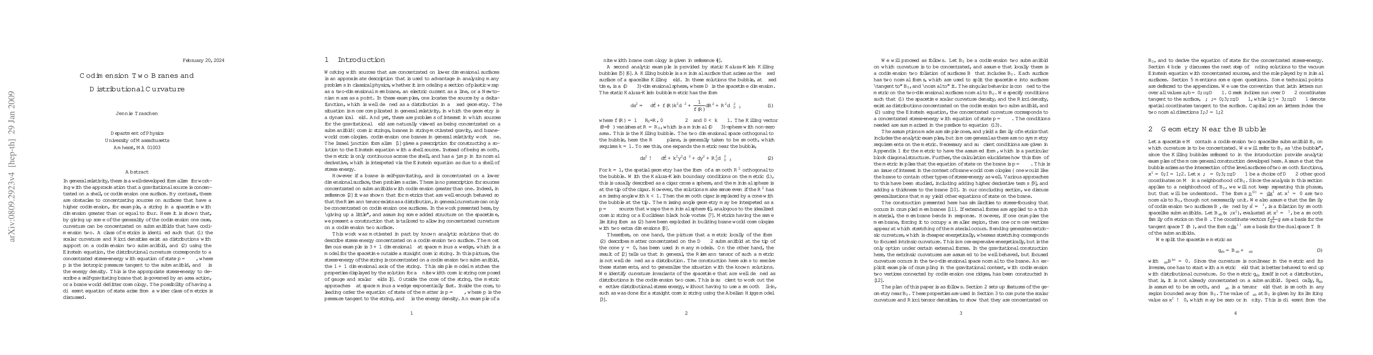 In general relativity, there is a well-developed formalism for working with the approximation that a gravitational source is concentrated on a shell, or codimension one surface. By contrast, there are obstacles to concentrating sources on surfaces that have a higher codimension, for example, a string in a spacetime with dimension greater than or equal to four. Here it is shown that, by giving up some of the generality of the codimension one case, curvature can be concentrated on submanifolds that have codimension two. A class of metrics is identified such that (1) the scalar curvature and Ricci densities exist as distributions with support on a co-dimension two submanifold, and (2) using the Einstein equation, the distributional curvature corresponds to a concentrated stress-energy with equation of state p equals minus the energy density, where p is the isotropic pressure tangent to the submanifold. This is the appropriate stress-energy to describe a self-gravitating brane that is governed by an area action, or a brane world deSitter cosmology. The possibility of having a different equation of state arise from a wider class of metrics is discussed.
