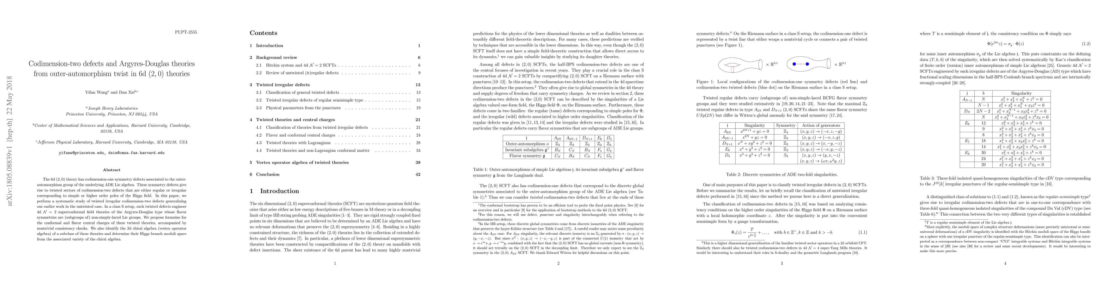 This paper systematically studies codimension-two defects in 6d $(2,0)$ theories arising from outer-automorphism twists, showing they engineer 4d $\mathcal{N}=2$ Argyres-Douglas superconformal field theories with non-simply-laced Lie group flavor symmetries, and proposes formulae for their central charges.