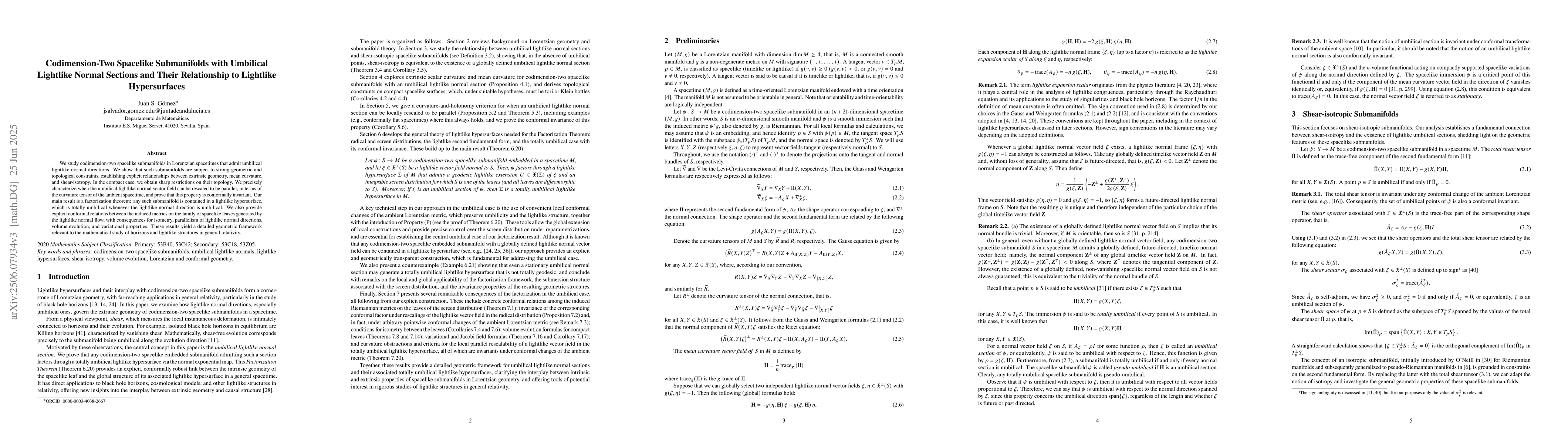 This paper studies codimension-two spacelike submanifolds in Lorentzian spacetimes with specific geometric constraints, revealing sharp restrictions on their topology and providing a detailed framework for understanding horizons and lightlike structures in general relativity.