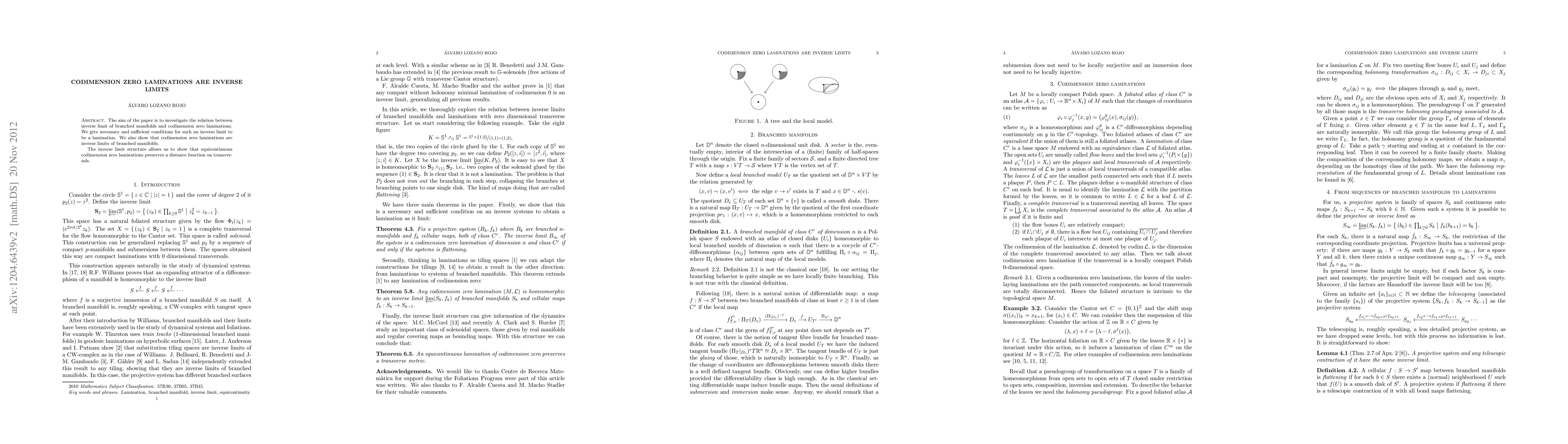 Summary: This paper explores the relationship between inverse limits of branched manifolds and codimension zero laminations, establishing necessary and sufficient conditions for an inverse limit to qualify as a lamination. It demonstrates that codimension zero laminations can be represented as inverse limits of branched manifolds, and this structure preserves a distance function on transversals.