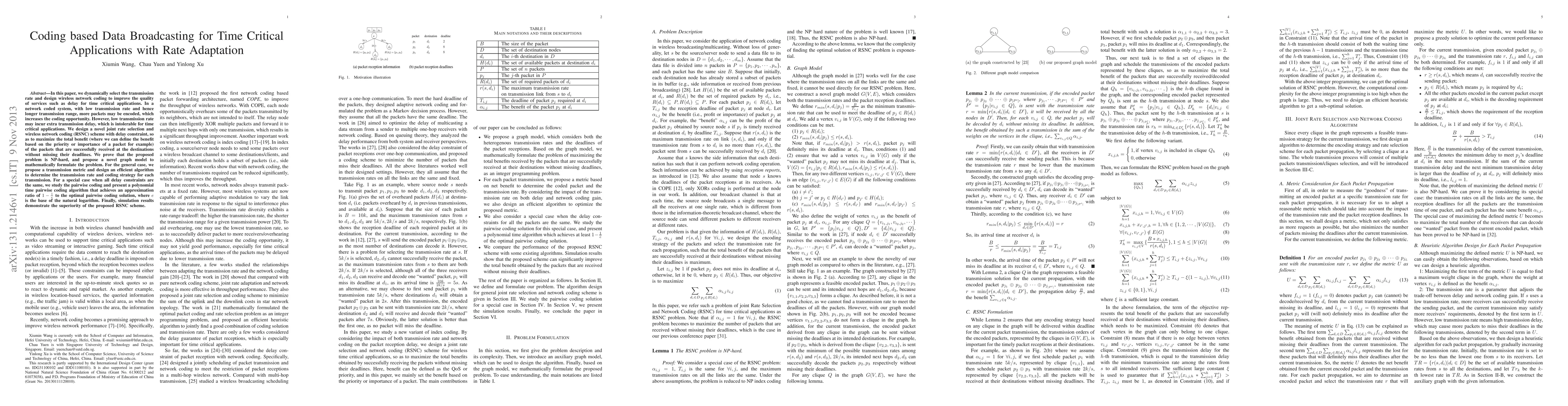 In this paper, we dynamically select the transmission rate and design wireless network coding to improve the quality of services such as delay for time critical applications. In a network coded system, with low transmission rate and hence longer transmission range, more packets may be encoded, which increases the coding opportunity. However, low transmission rate may incur extra transmission delay, which is intolerable for time critical applications. We design a novel joint rate selection and wireless network coding (RSNC) scheme with delay constraint, so as to maximize the total benefit (where we can define the benefit based on the priority or importance of a packet for example) of the packets that are successfully received at the destinations without missing their deadlines. We prove that the proposed problem is NP-hard, and propose a novel graph model to mathematically formulate the problem. For the general case, we propose a transmission metric and design an efficient algorithm to determine the transmission rate and coding strategy for each transmission. For a special case when all delay constraints are the same, we study the pairwise coding and present a polynomial time pairwise coding algorithm that achieves an approximation ratio of 1 - 1/e to the optimal pairwise coding solution, where e is the base of the natural logarithm. Finally, simulation results demonstrate the superiority of the proposed RSNC scheme.