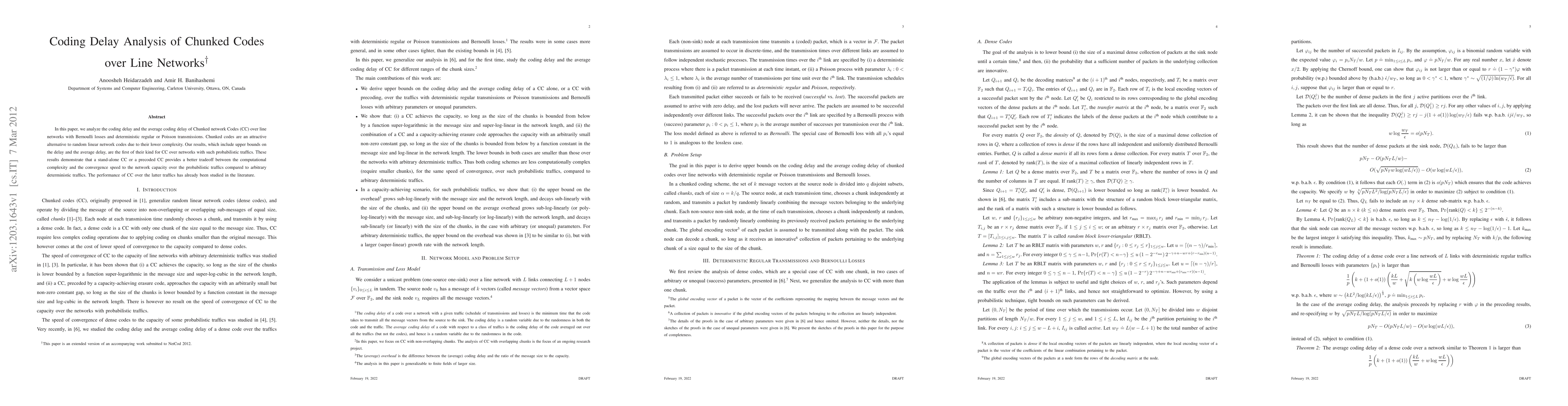 This paper analyzes the coding delay and average coding delay of Chunked Network Codes (CC) over line networks with probabilistic losses, providing the first upper bounds on delay for such scenarios. The results show that CC offers a better balance between computational complexity and convergence speed compared to random linear network codes.