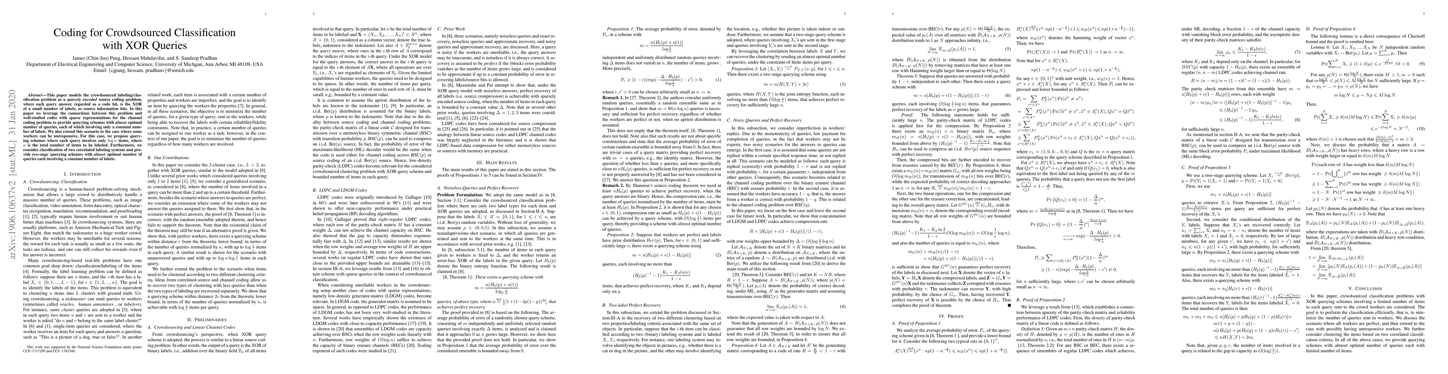 This paper models crowdsourced classification as a sparsely encoded source coding problem using XOR queries, leveraging sparse codes for optimal querying schemes. It also addresses unresponsive workers and correlated labeling systems, proposing efficient querying strategies involving minimal labels.