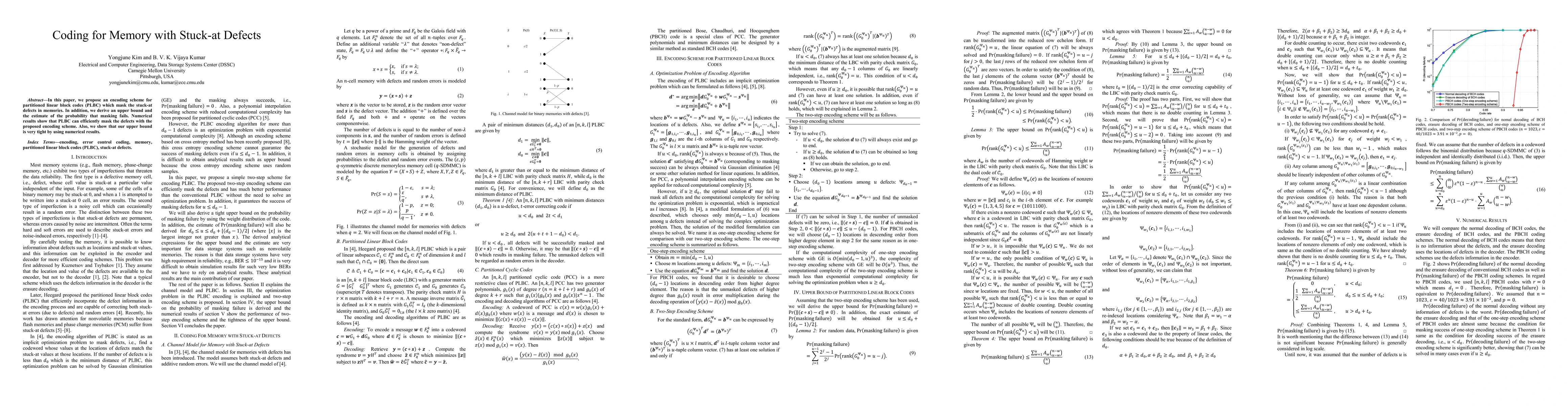 This paper proposes an encoding scheme for partitioned linear block codes (PLBC) to mask stuck-at defects in memory, deriving an upper bound for the probability of masking failure. Numerical results demonstrate the efficiency of the proposed scheme and the tightness of the derived upper bound.