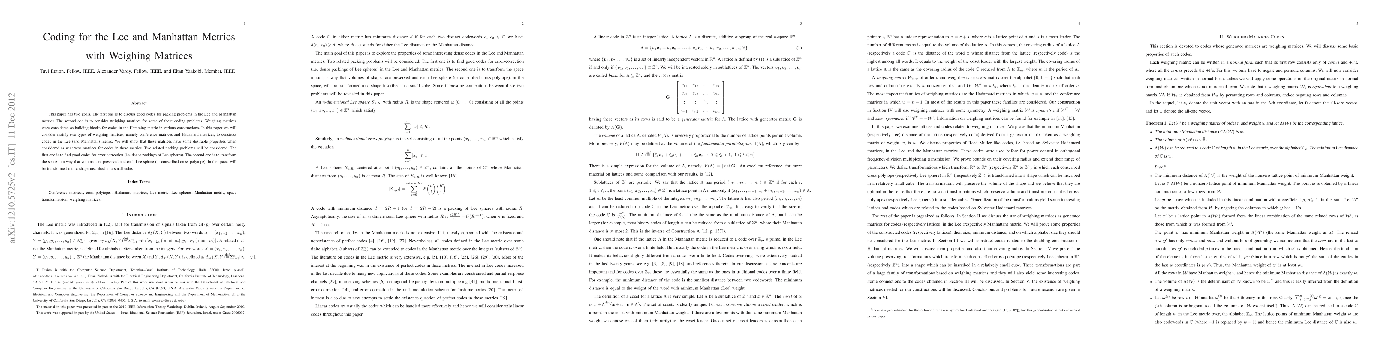 This paper explores optimal codes for packing problems under the Lee and Manhattan metrics, leveraging conference and Hadamard weighing matrices. It demonstrates the effectiveness of these matrices as code generators and discusses their applications in error-correction and space transformation for dense packings of Lee spheres.