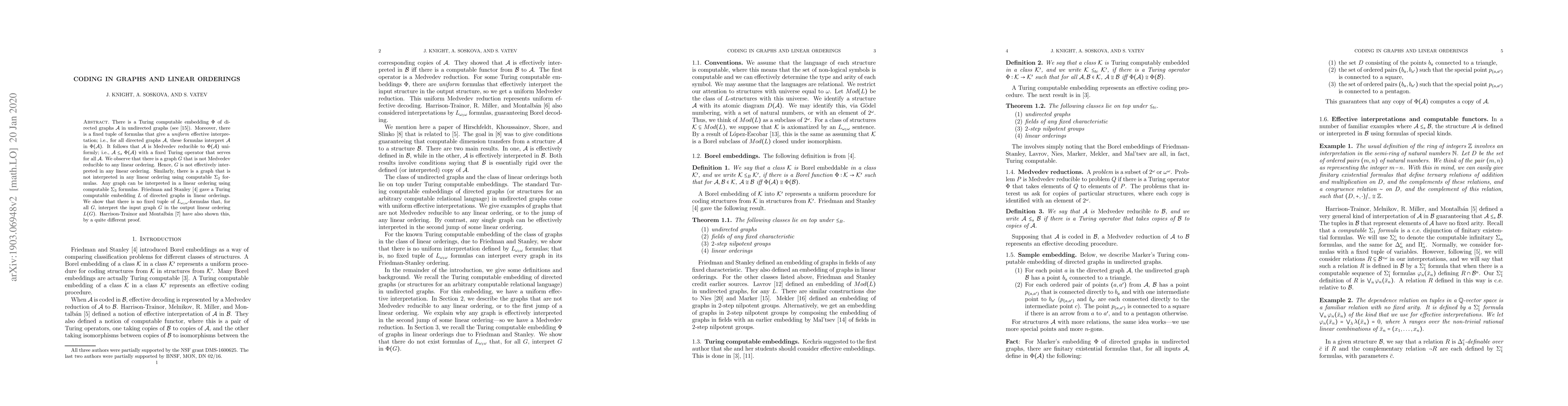 There is a Turing computable embedding $\Phi$ of directed graphs $A$ in undirected graphs. Moreover, there is a fixed tuple of formulas that give a uniform interpretation; i.e., for all directed graphs $A$, these formulas interpret $A$ in $\Phi(G)$. It follows that A is Medvedev reducible to $\Phi(A)$ uniformly; i.e., there is a fixed Turing operator that serves for all $A$. We observe that there is a graph $G$ that is not Medvedev reducible to any linear ordering. Hence, $G$ is not effectively interpreted in any linear ordering. Similarly, there is a graph that is not interpreted in any linear ordering using computable $\Sigma_2$ formulas. Any graph can be interpreted in a linear ordering using computable $\Sigma_3$ formulas. Friedman and Stanley gave a Turing computable embedding L of directed graphs in linear orderings. We show that there is no fixed tuple of $L_{\omega_1,\omega}$ formulas that, for all $G$, interpret the input graph $G$ in the output linear ordering $L(G)$. Harrison-Trainor and Montalb\'an have also shown this, by a quite different proof.