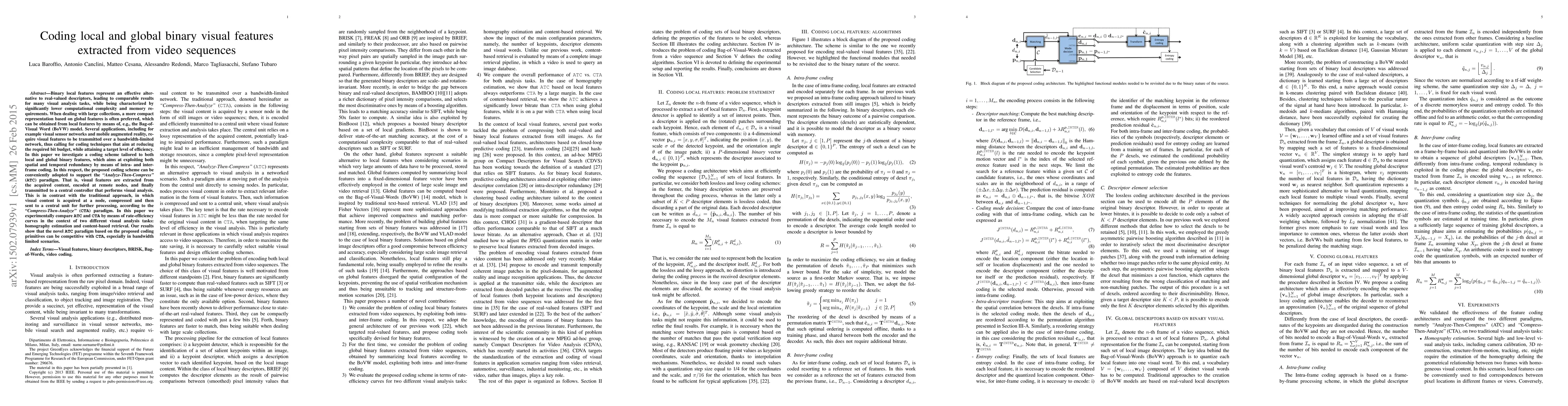 Binary local features represent an effective alternative to real-valued descriptors, leading to comparable results for many visual analysis tasks, while being characterized by significantly lower computational complexity and memory requirements. When dealing with large collections, a more compact representation based on global features is often preferred, which can be obtained from local features by means of, e.g., the Bag-of-Visual-Word (BoVW) model. Several applications, including for example visual sensor networks and mobile augmented reality, require visual features to be transmitted over a bandwidth-limited network, thus calling for coding techniques that aim at reducing the required bit budget, while attaining a target level of efficiency. In this paper we investigate a coding scheme tailored to both local and global binary features, which aims at exploiting both spatial and temporal redundancy by means of intra- and inter-frame coding. In this respect, the proposed coding scheme can be conveniently adopted to support the Analyze-Then-Compress (ATC) paradigm. That is, visual features are extracted from the acquired content, encoded at remote nodes, and finally transmitted to a central controller that performs visual analysis. This is in contrast with the traditional approach, in which visual content is acquired at a node, compressed and then sent to a central unit for further processing, according to the Compress-Then-Analyze (CTA) paradigm. In this paper we experimentally compare ATC and CTA by means of rate-efficiency curves in the context of two different visual analysis tasks: homography estimation and content-based retrieval. Our results show that the novel ATC paradigm based on the proposed coding primitives can be competitive with CTA, especially in bandwidth limited scenarios.