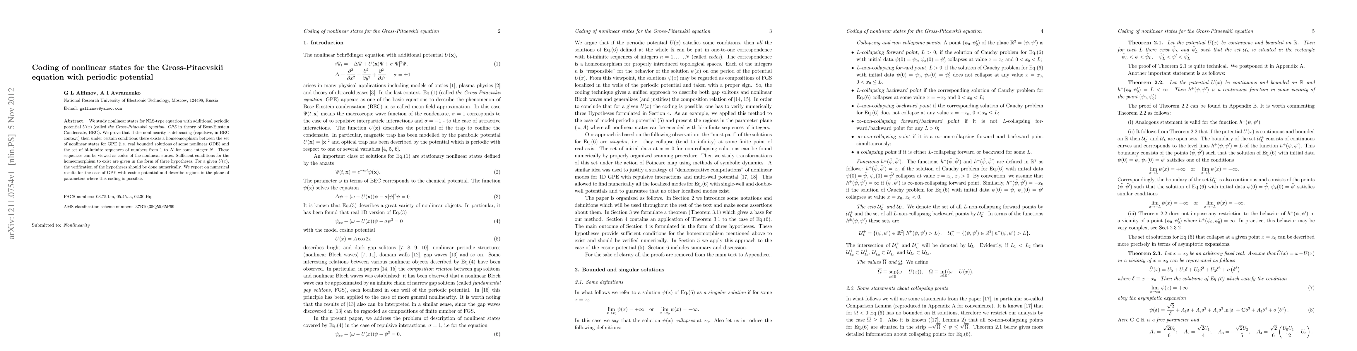 This paper investigates nonlinear states in the Gross-Pitaevskii equation with periodic potential, proving the existence of a homeomorphism between these states and bi-infinite sequences under defocusing nonlinearity. Numerical results for cosine potential demonstrate parameter regions where this coding is feasible.