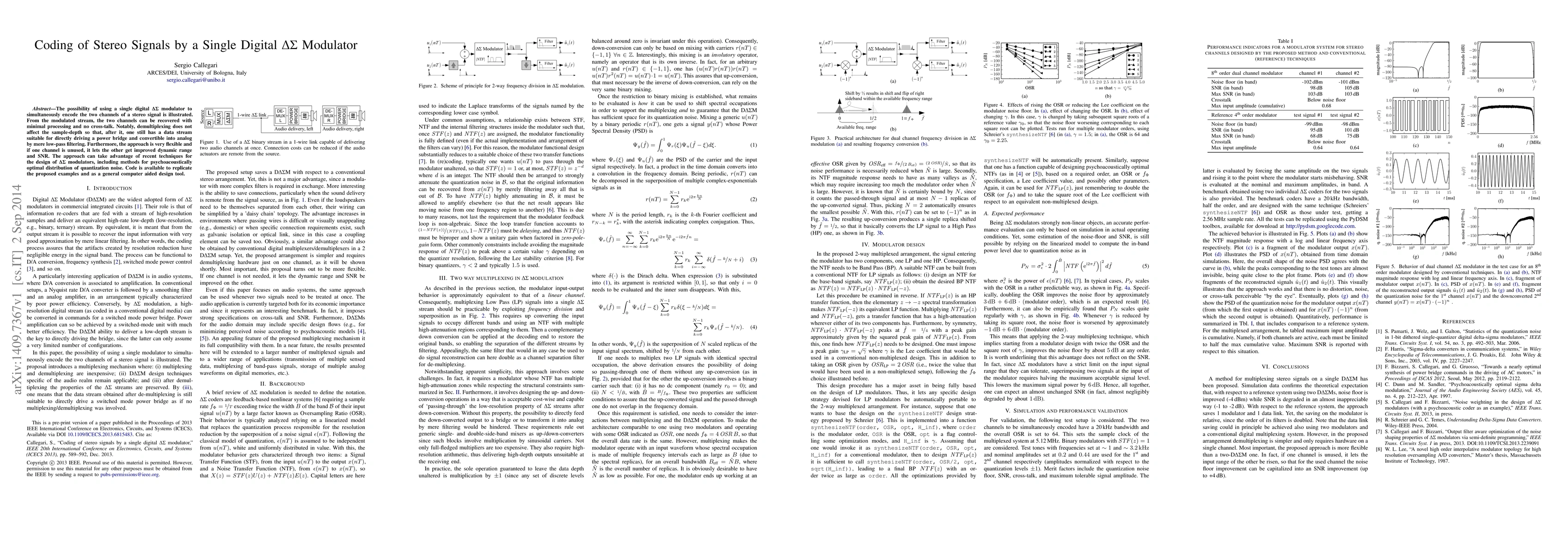 The possibility of using a single digital {\Delta}{\Sigma} modulator to simultaneously encode the two channels of a stereo signal is illustrated. From the modulated stream, the two channels can be recovered with minimal processing and no cross-talk. Notably, demultiplexing does not affect the sample-depth so that, after it, one still has a data stream suitable for directly driving a power bridge and convertible into analog by mere low-pass filtering. Furthermore, the approach is very flexible and if one channel is unused, it lets the other get improved dynamic range and SNR. The approach can take advantage of recent techniques for the design of {\Delta}{\Sigma} modulators, including methods for psychoacoustically optimal distribution of quantization noise. Code is available to replicate the proposed examples and as a general computer aided design tool.